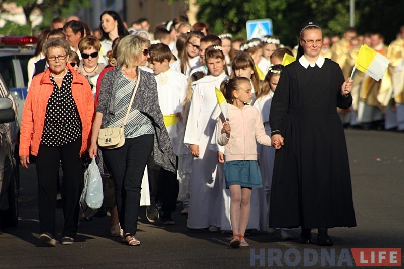 Традыцыйная працэсія ў гонар свята Божага Цела прайшла ўвечары 15 чэрвеня па цэнтральных вуліцах Гродна. У ёй прынялі ўдзел тысячы вернікаў.