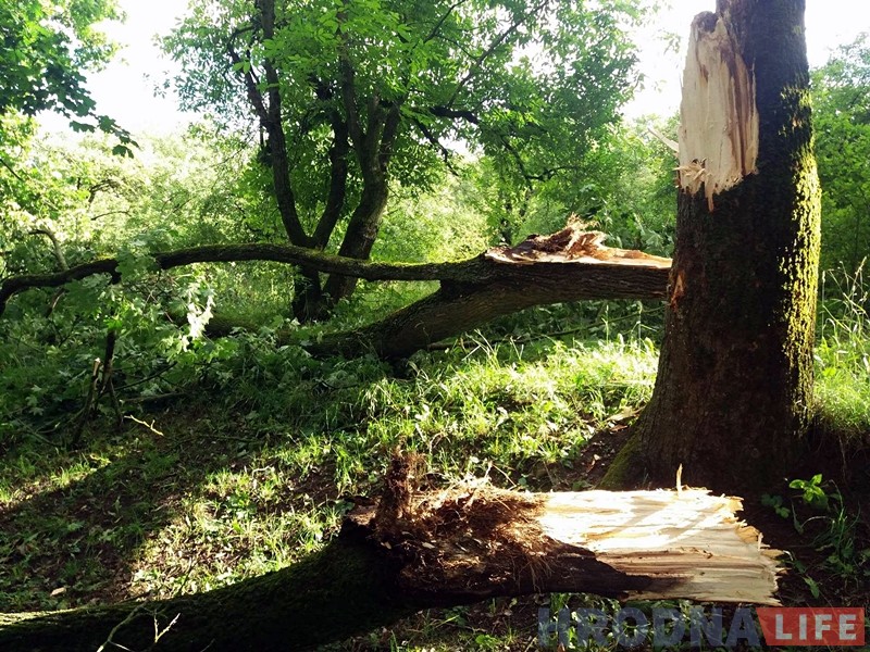 Моцныя дажджы і парывісты вецер да 20 метраў у секунду прайшлі па тэрыторыi Гродна з 15:30 да 16:00. Увечары ў горадзе працавалі супрацоўнікі Зелянбуда: яны прыбіралі паваленыя дрэвы і зламаныя галіны.