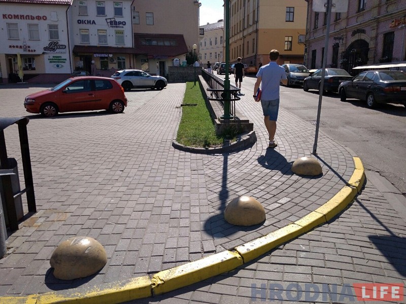 Штодня бетонныя паўсферы з паркоўкі, як платнай, так і для людзей з інваліднасцю, нехта перасоўвае на тратуар. У выніку немагчыма прайсці пешаходам, праехаць веласіпедыстам і людзям з дзіцячымі вазкамі.