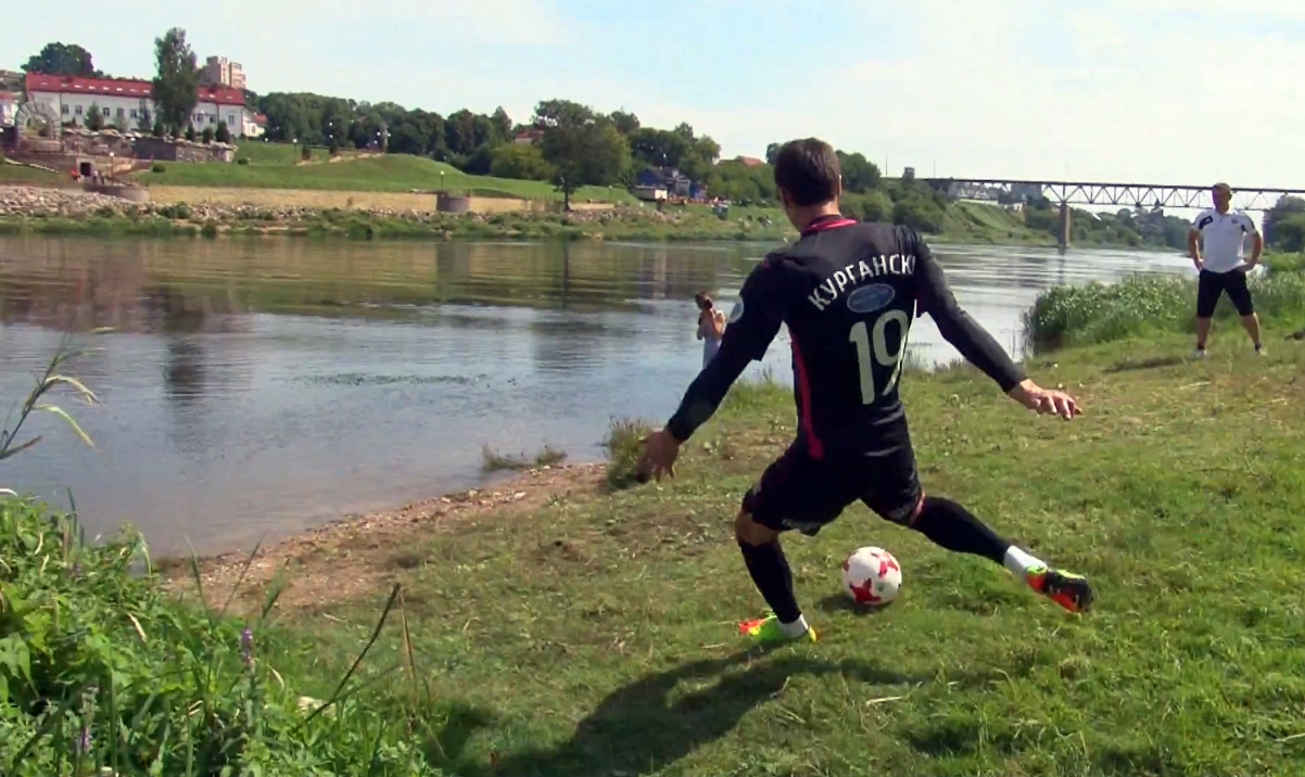 Іван Санюкевiч, Кірыл Ячынскi, Уладзімір Жураў і Сяргей Курганскі спачатку патрэніраваліся ў далечыні ўдару на газоне ЦСК «Нёман», каб зразумець, на колькі вялікія іх шанцы перабіць мяч на іншы бок Нёмана. Шырыня ракі ў цэнтры горада складае звыш 100 метраў. Пасля футбалісты перамясціліся на бераг ракі.