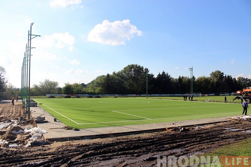Новае поле са штучным газонам да Дня горада адкрыць не паспелі. Вінаватае надвор’е і шэраг іншых фактараў. Новы спартыўны аб’ект плануецца здаць у кастрычніку.