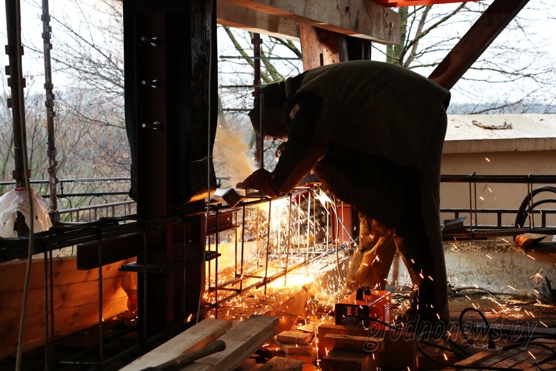 Сёння дошкі будучага абліцоўвання рыхтуюць: канструкцыі фрэзеруюцца, праходзяць неабходную тэрмаапрацоўку. Прыступіць да вонкавай ашалёўкі драўлянай сцяны могуць ужо праз два тыдні. Пакуль жа тут ідуць працы па ўмацаванні існуючага падмурка. Зверху на яго ўсталёўваецца бетонная бэлька – ростверк, яшчэ адна бетонная канструкцыя з’явіцца па контуры існуючага падмурка збоку.