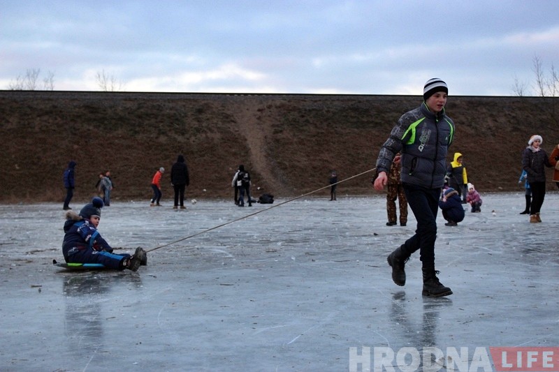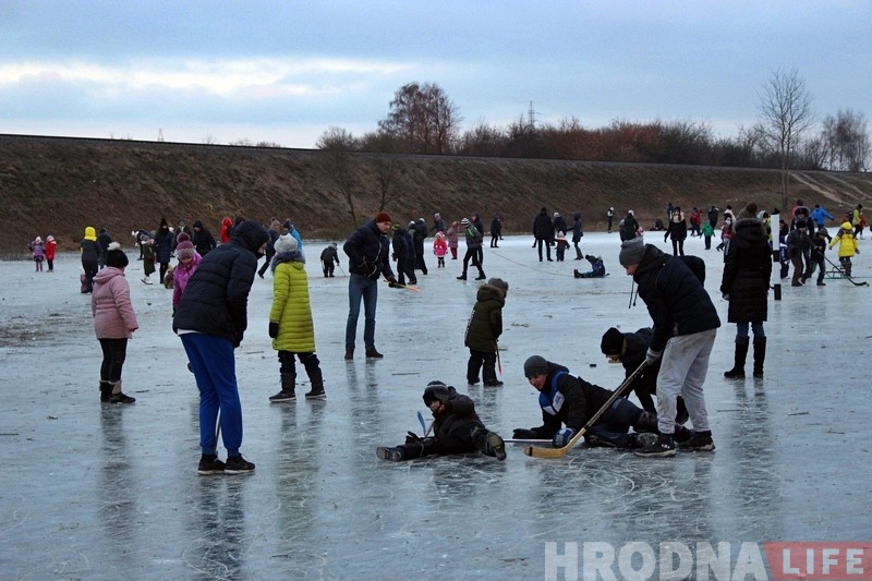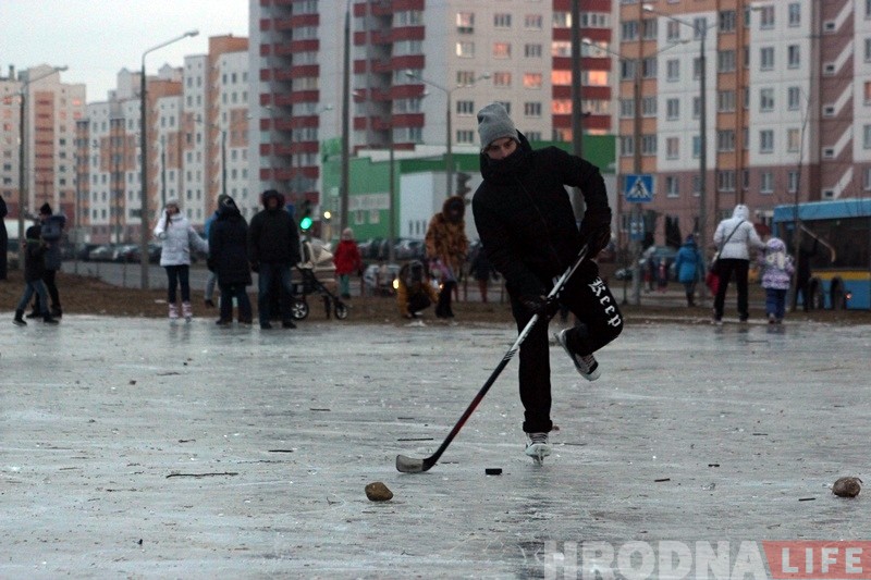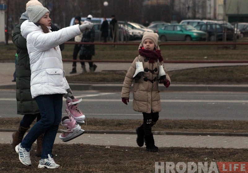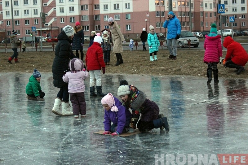 За мінулыя выхадныя лядовую пляцоўку ў мікрараёне наведала некалькі сотняў чалавек. З раніцы да вечара дарослыя і дзеці катаюцца там на каньках і санках, а таксама гуляюць у хакей і футбол.