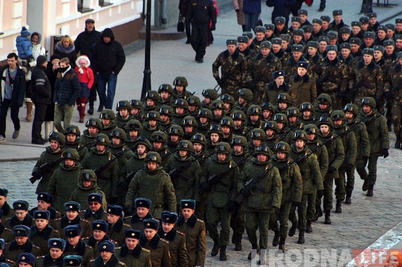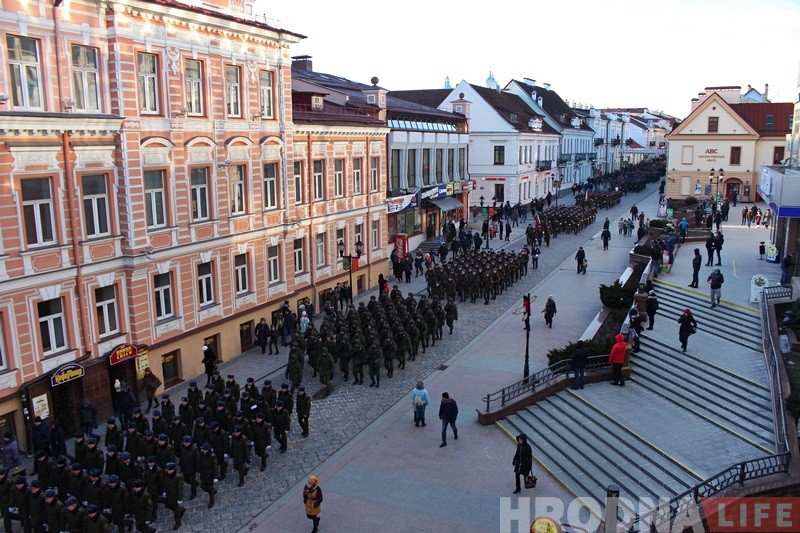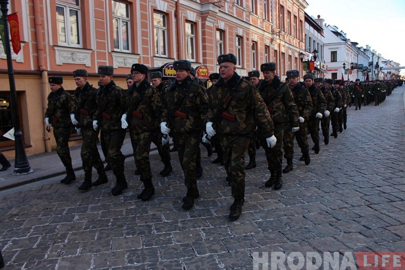 У шэсці з плошчы Савецкай да плошчы Тызенгаўза прынялі ўдзел 14 каробак салдат: ваенныя, міліцыя, МНС і кадэты.