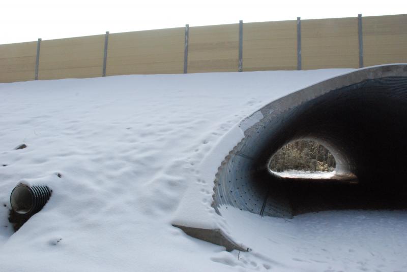 Скразная труба з гафрыраванага металу з двух бакоў выводзіць прама ў лясныя зараснікі, магістраль ідзе паверсе. Пазнаць пераход можна па шумападаўляльных панэлях уздоўж насыпу. Але калідораў з сеткі, якія павінны адціснуць дзікіх жывёл ад праезнай часткі і непрыкметна накіраваць у тунэль, пакуль няма.