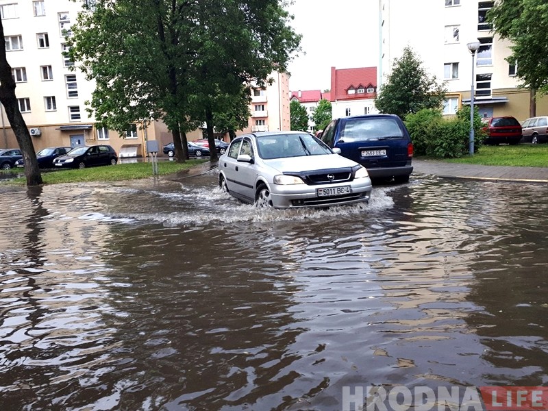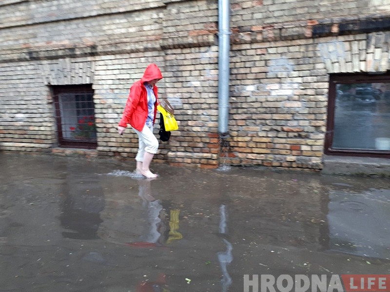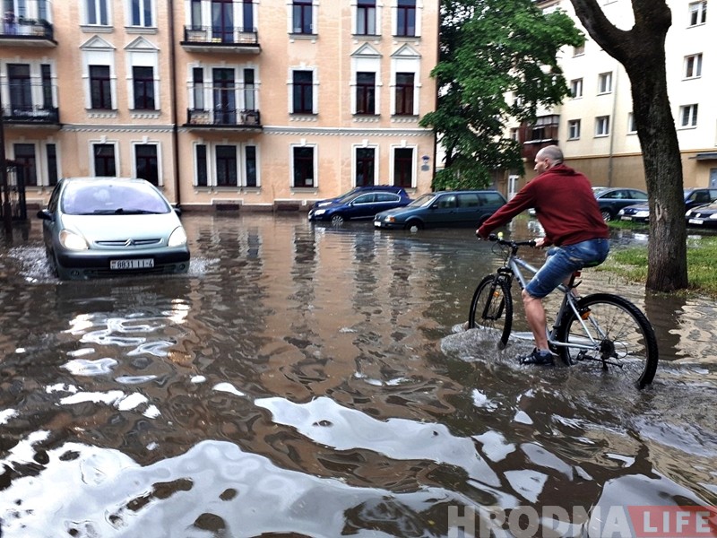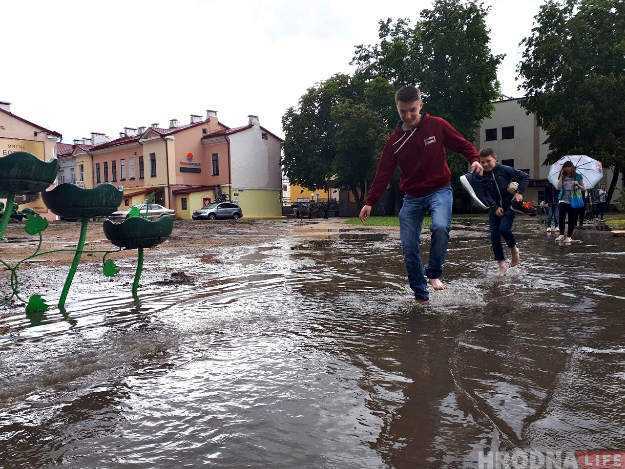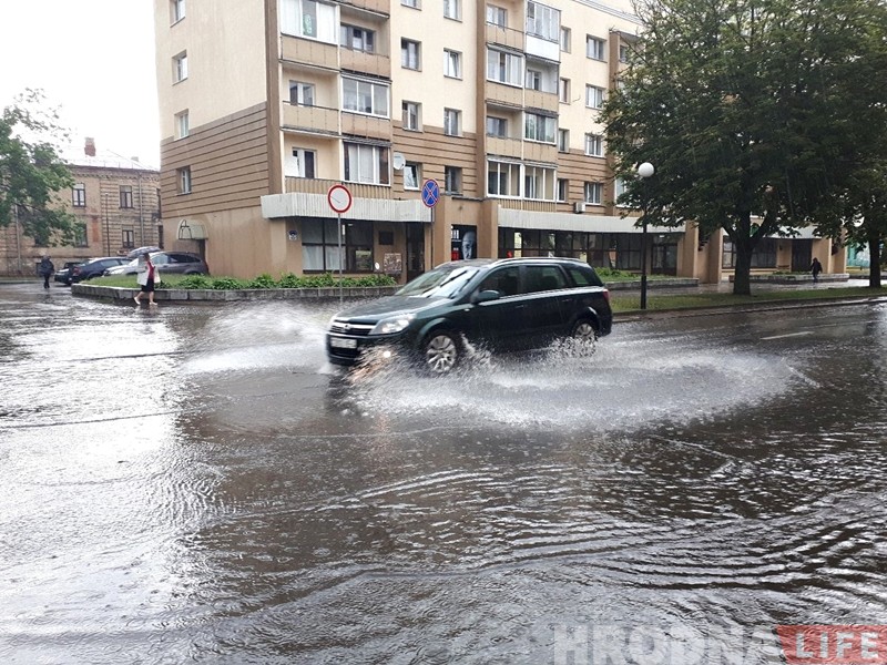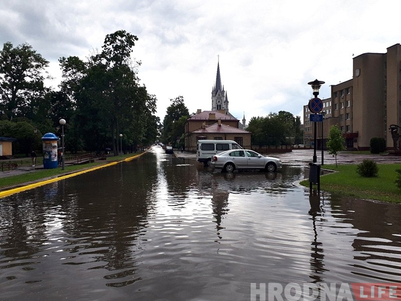 Першы моцны дождж у маі зноў паказаў гродзенцам праблемныя месцы горада. Былі затопленыя цэнтральныя вуліцы. Рух грамадскага транспарту быў ускладнены.