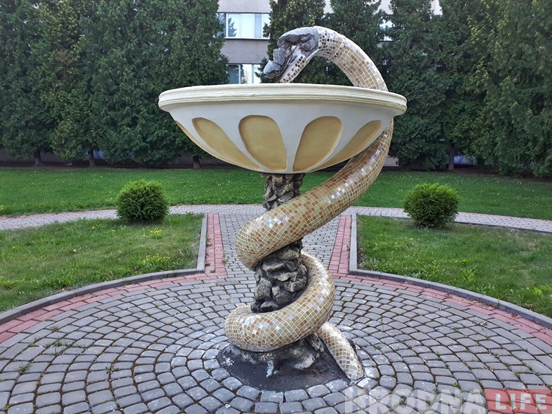 Сімвал медыцыны – скульптура-фантан «змяя з чашай» была ўстаноўлена ля медуніверсітэта яшчэ ў савецкія гады, хто яе аўтар невядома. Некалькі гадоў таму падчас добраўпарадкавання тэрыторыі ля навучальнай установы фантан аднавілі. Работамі займаўся мясцовы мастак Уладзімір Качан.