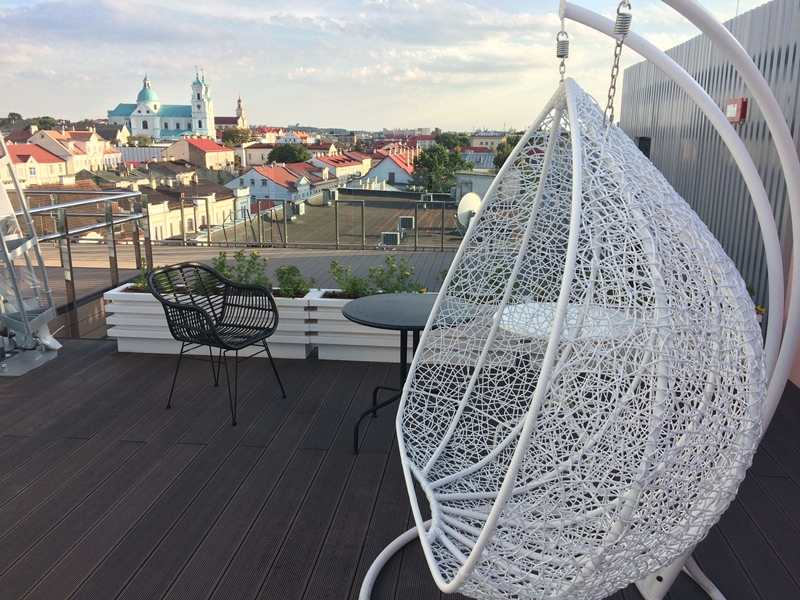 Назіральную пляцоўку над былым універмагам сімвалічна назвалі “Дахі старога горада”. Адсюль, як на далоні, бачныя дахі старых гродзенскіх будынкаў, якія можна ўбачыць не праз аконнае шкло і не праз празрыстыя сценкі агляднага ліфта, а ўжывую.
