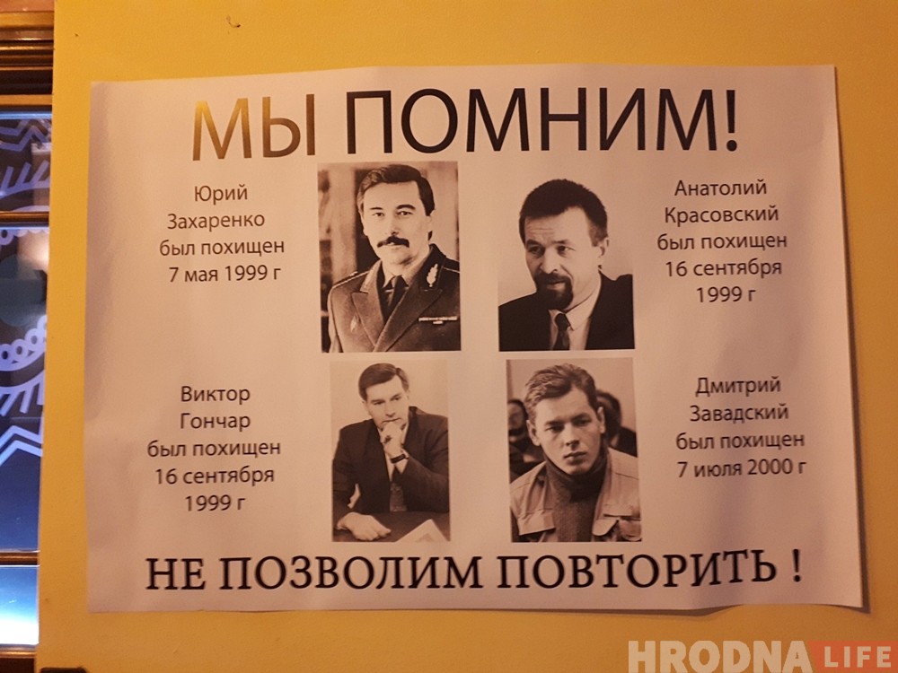 Увечары 16 верасня на вуліцы Савецкай з’явіўся вялікі плакат са згадваннем выкрадзеных і зніклых без вестак палітыкаў Віктара Ганчара і Юрыя Захаранкі, бізнэсмэна Анатоля Красоўскага і журналіста Дзмітрыя Завадскага.