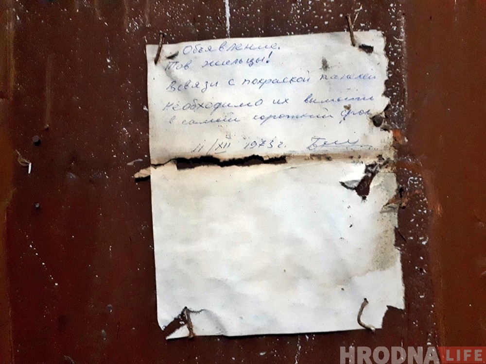 “Так, гэта аб’ява з тых часоў, калі ў пад’ездзе рабілі рамонт. Некалькі гадоў таму нехта зняў з дзвярэй металічную шыльду, а пад ёй аказалася аб’яву 1973 года. Ужо прайшло некалькі гадоў, як знялі тую шыльду, а паперка ўсё яшчэ вісіць. Сёння на аб’яву мы ўжо і не зважаем, але і прыбіраць яе не спяшаемся “, – распавяла жыхарка дома Тамара.