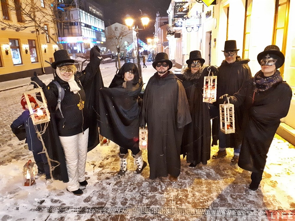 Увечары 9 студзеня незвычайны касцюмаваны перфоманс зладзілі ў цэнтры Гродна госці з Расіі і Украіны. Кампанія з васьмі турыстаў у чорных касцюмах і з самаробнымі ліхтарыкамі прайшлася па вуліцах горада і фатаграфаваліся з гродзенцамі.