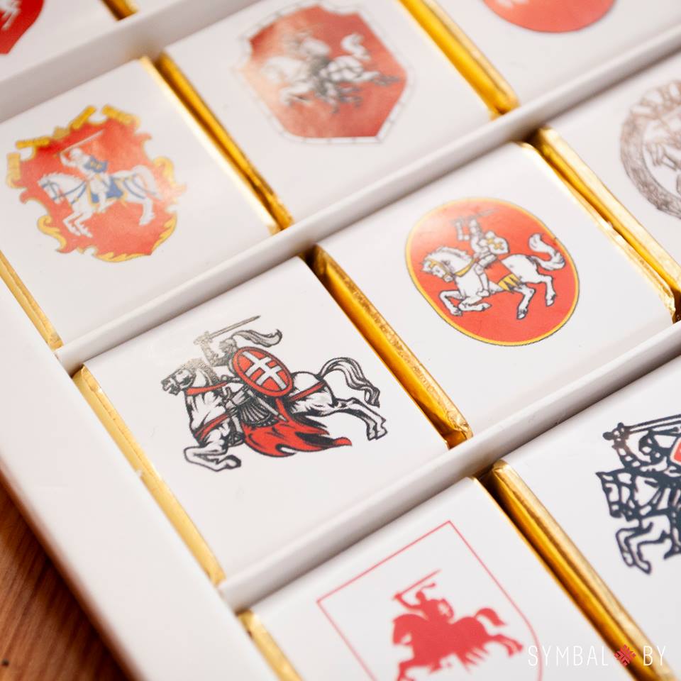 Сувенірны набор шакаладак «Пагоня побач», упрыгожаных выявамі герба «Пагоня» розных часоў, з’явіўся ў продажы 22 лютага. Ён стаў вынікам супрацы крамы Symbal.by з кампаніяй «Каралева Агню груп» і кандытарскай фабрыкай «Спартак». У сувенірную каробку запакавана 12 малочных шакаладак з утрыманнем какава-прадуктаў 32%. Агульная вага цукерак ва ўпакоўцы – 60 грамаў. На зваротным боку апакавання прыведзена гісторыя галоўнага дзяржаўнага сімвала Беларусі – “Пагоні”.