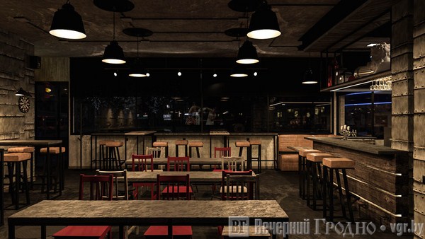 Будучы лофт-бар разлічаны на 45 месцаў – можна сядзець за стойкамі або на мяккіх канапах са столікамі.