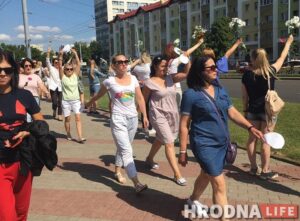 У Гродне 12 верасня прайшла жаночая акцыя пратэсту. Удзельніцы спявалі песні, вадзілі карагод. Ля гандлёвага цэнтру “Нёман” яны сарвалі маску з невядомага ў чорным, які здымаў іх на камеру.
