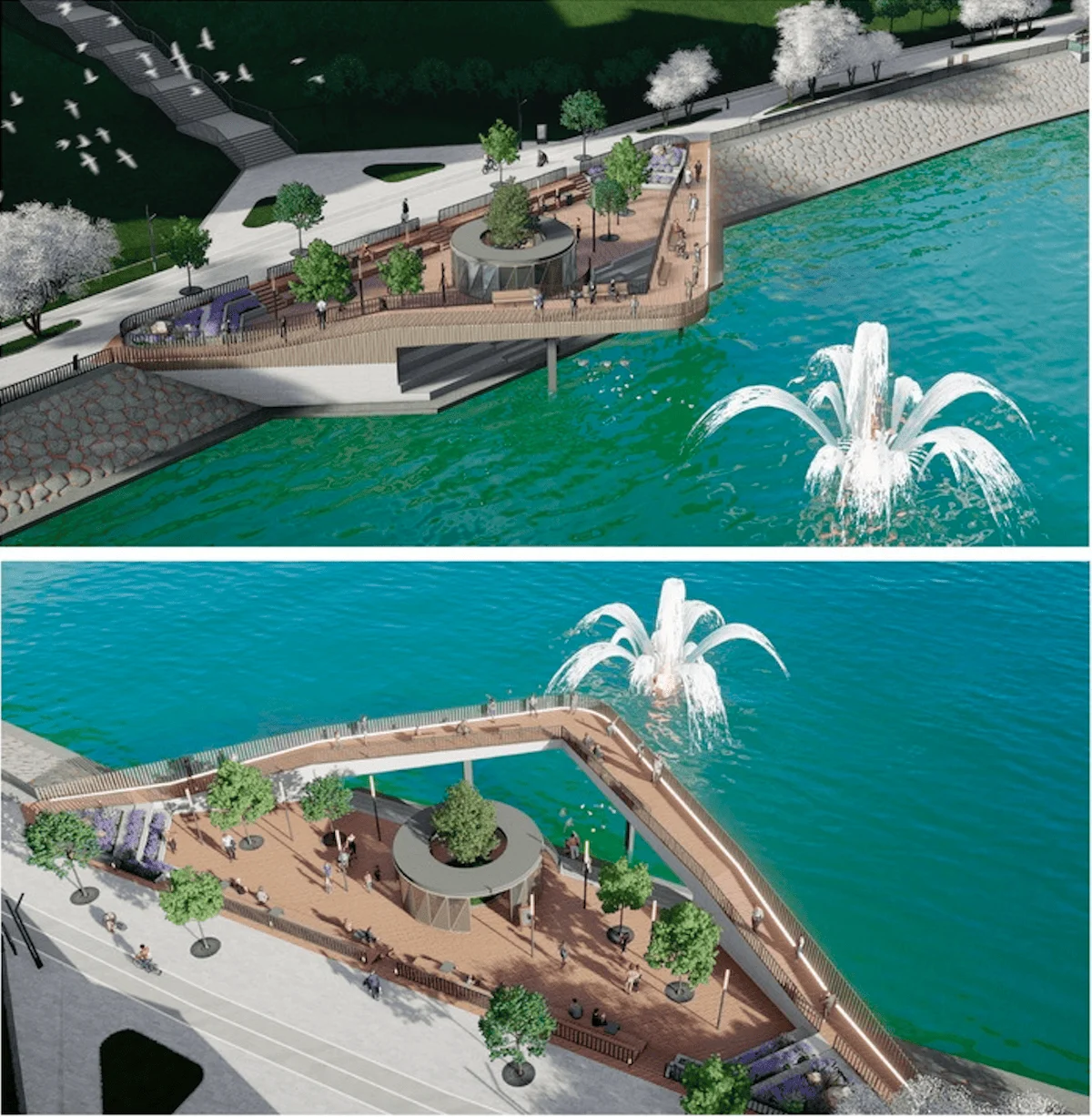 З’явіцца і аглядная пляцоўка. Яе зробяць у выглядзе вуглавога мастка, з вяршыні якога будзе адкрывацца від на Нёман. Побач усталююць плаваючы каляровы фантан.