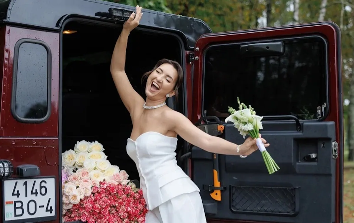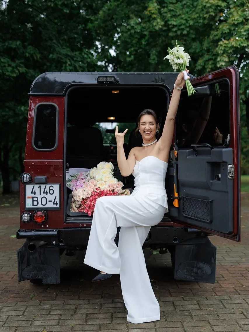 Блогерка адмовілася ад пышнай вясельнай сукенкі і фаты, у дзень шлюбу яна была ў белым касцюме.