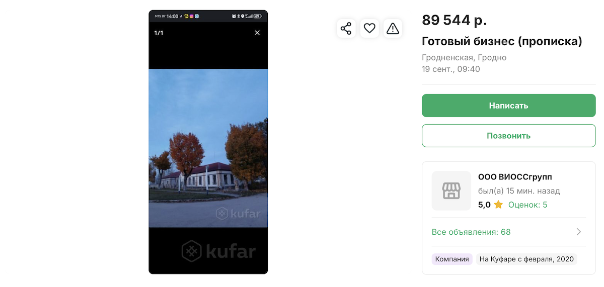 Аўтар аб’явы — «ООО «ВИОССгрупп». Сярод іншых прапаноў фірмы – арэнда пакоя ў Дубаўцах, каб атрымаць прапіску. Месяц арэнды каштуе 100 руб., але патрэбная перадаплата за паўгода наперад. Уладальнік гатовы здаваць пакой і беларусам, і іншаземцам “для розных мэт”.