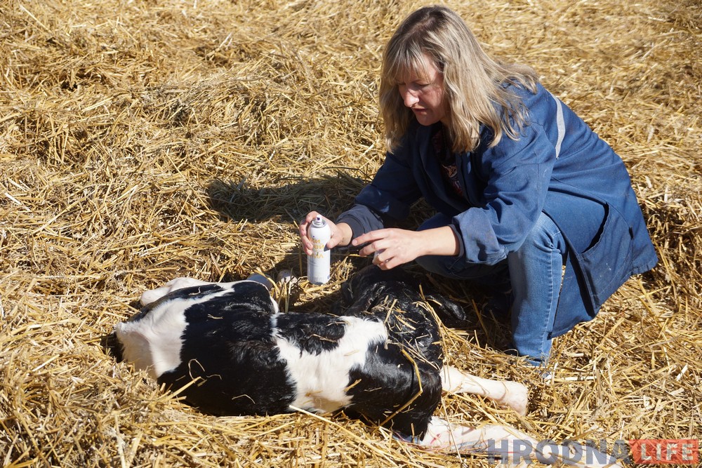 Малое – яшчэ не аблізанае, мокра-чорна-белае цяля ляжыць на саломе, пазірае вялікімі сінімі вачыма. “Пупавіну пара апрацаваць”. Вольга спрытна падгінаецца, каб пралесці пад агароджу, прысаджваецца каля нованароджанага. У пару рухаў дастае да жывоціка, пшыкае спрэем з балончыка, абцірае яшчэ слізкую галаву. Як малое стане на ногі, яго забяруць у цялятнік і пакормяць праз зонд.