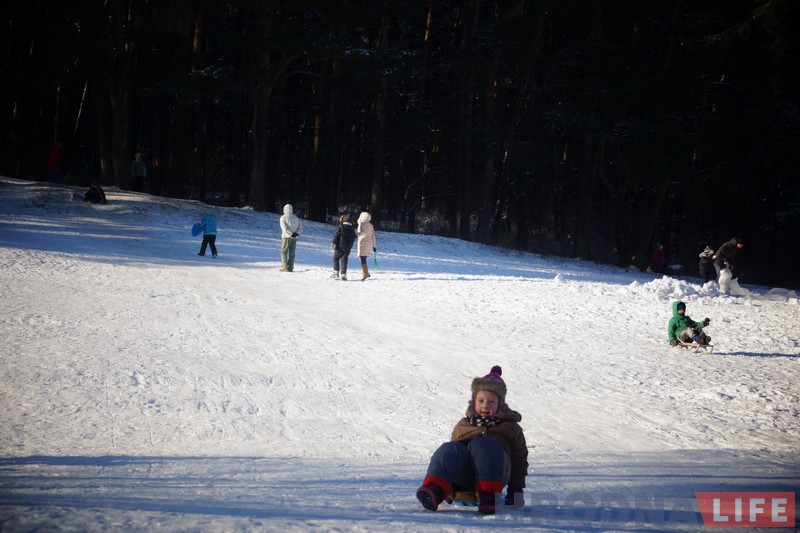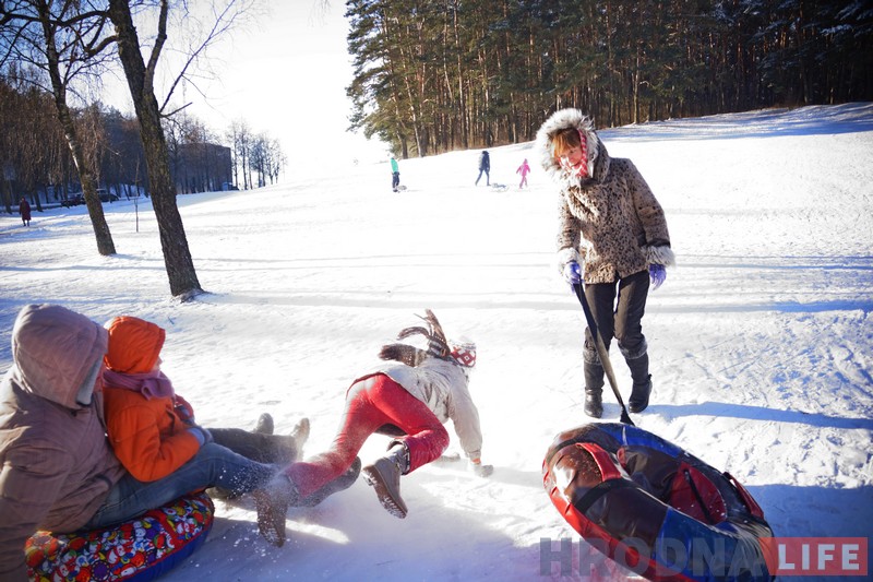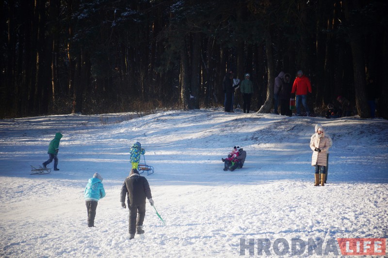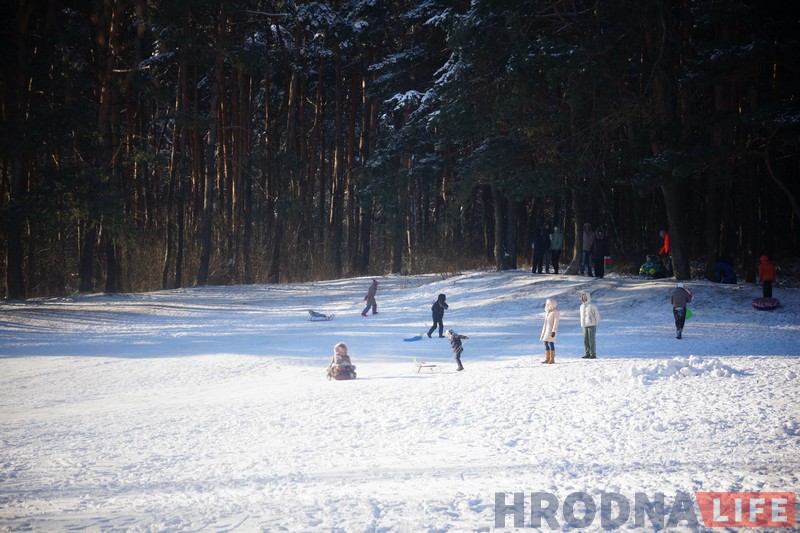 На ўскрайку леса было намнога больш людна. Горку апанавалі дзеці з санкамі, лядзянкамі і “ватрушкамі”. Бацькі некаторых з дзяцей таксама з’язджалі з горкі разам з малымі.