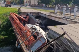 Проста ў цэнтры Смаргоні абвалілася частка моста. У гэты час па ім ехала аўтавышка ЖКГ з кіроўцам і пасажырам. Пашкоджаны мост з аўтавышкай. Крыніца:…