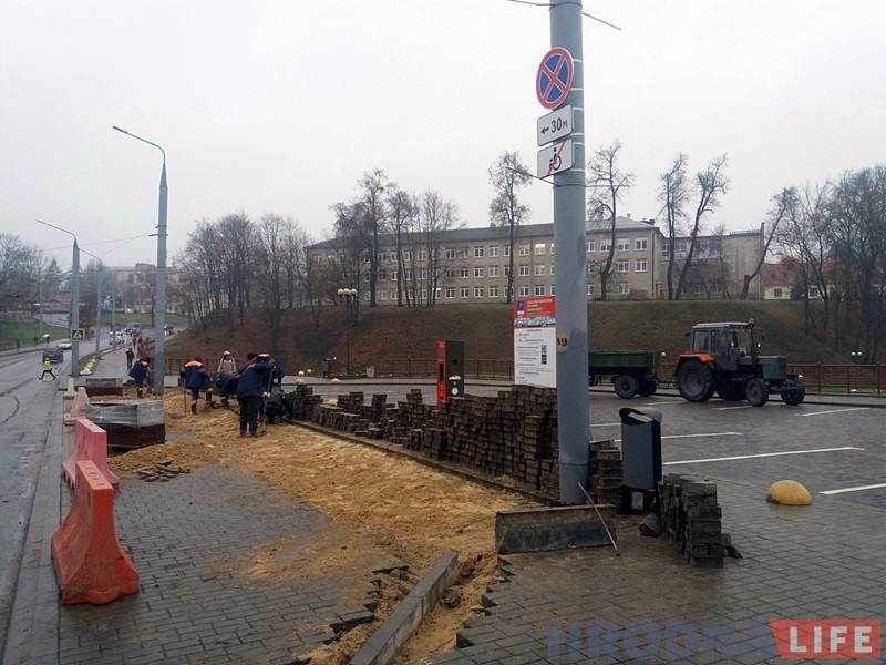 В середине сентября бесплатную парковку на Виленской решили сделать парковкой только для инвалидов. Через два месяца рабочие вернулись на парковку и снова разбирают плитку.