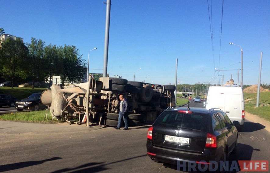 В тот момент, когда в центре Гродно мотоцикл столкнулся с бусом, на улице Клецкова перевернулась бетономешалка, что также затруднило движение по городу.