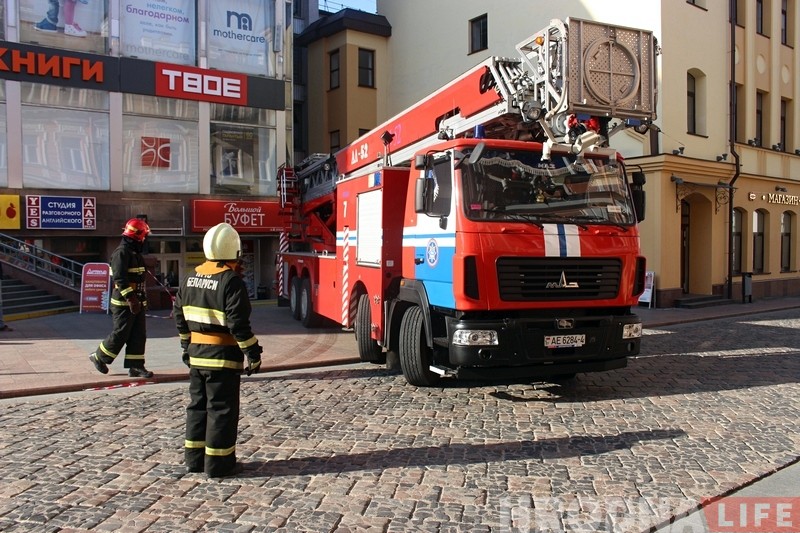 Территория у входа в магазин была быстро оцеплена еще до приезда сотрудников МЧС. Они поднялись на вышке и убрали осколки стекла на последнем этаже торгового дома.