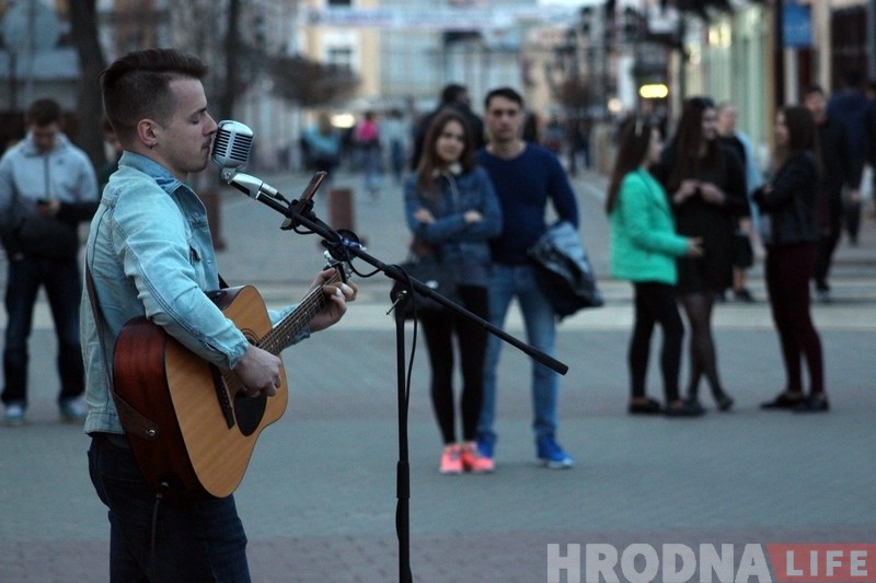 Вечером 15 апреля минский уличный музыкант Максим Соколов устроил на Советской площади в Гродно самый настоящий концерт. Артист три часа пел на разных языках и собрал много слушателей.
