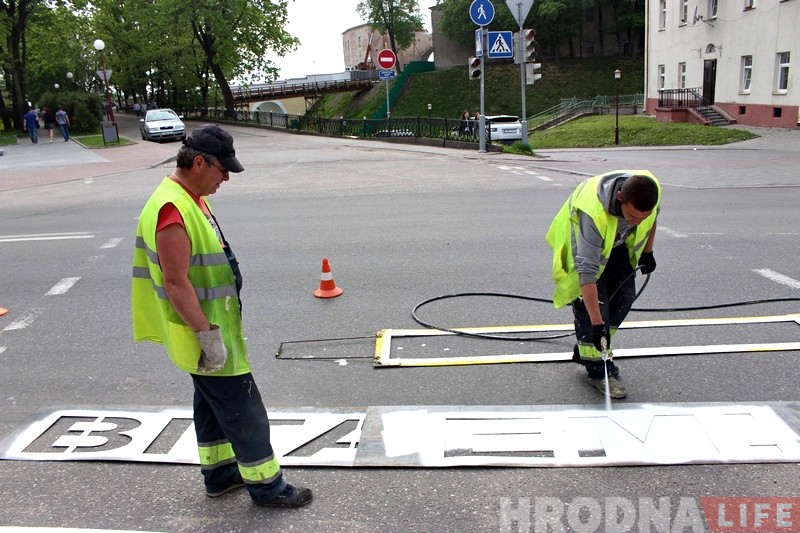 Первая надпись «Вітаем» появился на пешеходном переходе в районе автовокзала в конце апреля. К 9 мая в центре Гродно появится еще 5 таких надписей. Такое нововведение служб пришлось по душе как гродненцом, там и гостям города.