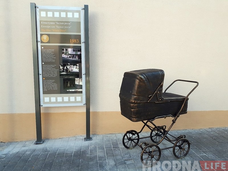 На улице Тельмана появилась кованая коляска по мотивам фильма «Белые Росы». Именно здесь в 1983 году снимали эпизод картины, где герой фильма Василий остановил детскую коляску с бутылками.
