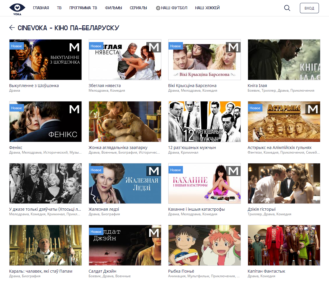 Белорусы уже привыкли смотреть кино в белорусской озвучке в кинотеатрах — благодаря проекту «Беларускія ўікенды», реализуемого компанией «Кінаконг» при поддержке velcom, известные фильмы и даже премьеры с белорусским дубляжом ежемесячно показывают на больших экранах по всей стране. Но до сих пор не существовало единой платформы, где можно было бы найти и посмотреть фильмы и мультфильмы в белорусском озвучке онлайн. VOKA решили исправить эту нелепость и создали раздел CINEVOKA, который на данный момент состоит из 50 кинолент в белорусской озвучке — от драм и боевиков к аниме и мультфильмов.