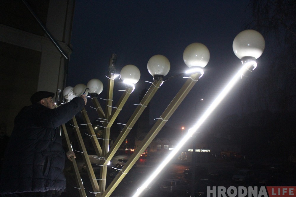 Основная традиция Хануки — церемония зажигания свечей. В Гродно она начинается с того, что раввин Ицхак Кофман и председатель общины Борис Квятковский зажигают первые две большие ханукальные свечи, которые установлены на фасаде синагоги. В этом году впервые вместе с зажиганием свечей прошел салют.