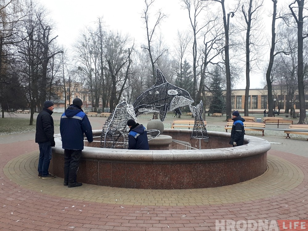 Сотрудники «Горсвета» устанавливают новогоднюю иллюминацию в Гродно. Уже 6 декабря новые световые декорации появились на площади Ленина и в парке Жилибера. Здесь старый фонтан украшают ныряющими в воду косатками.