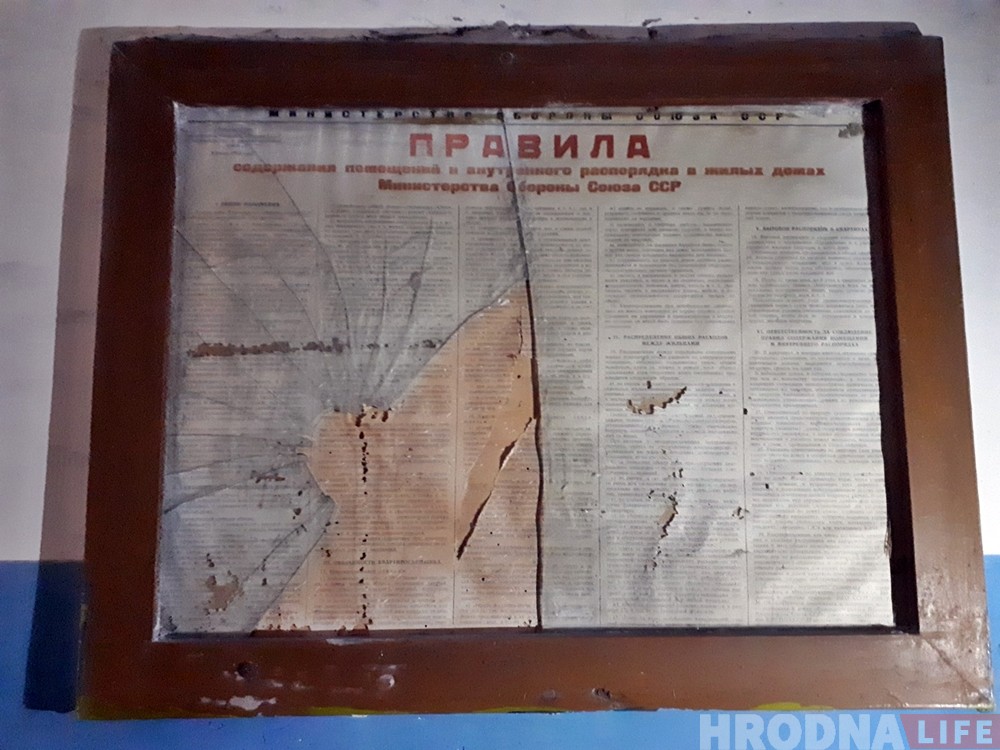 На объвлении написано: «Правила содержания помещений и внутреннего распорядка в жилых домах Министерства Обороны Союза ССР, утверждены Заместителем Министерства Обороны СССР по строительству и расквартированию войск. 9 июля 1955 года». Дело в том, что в послевоенные годы тут жили семьи военных.