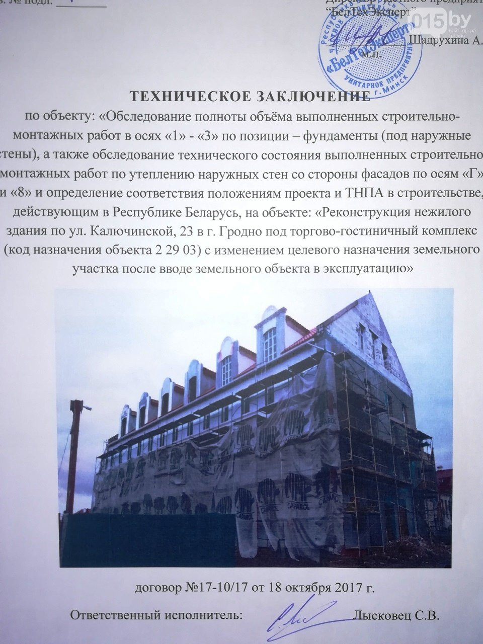 Поставка декора от ИП Приходько, по словам предпринимателя, пришла бракованной, не упакованной, грязной, без накладных. Декор выгрузили прямо на гору мусора у объекта. Семашко настаивал, чтобы декор с ним предварительно обсудили, чего не было сделано. Он говорит, что Вячеслав Радюкевич, замдиректора ООО «Городское строительство», захотел сэкономить и заказал декор у Приходько без согласования с хозяином отеля. Когда новые строители наводили порядок на площадке, часть строительного мусора с разрешения Семашко загрузили в машину и отвезли на дачу бригадира.