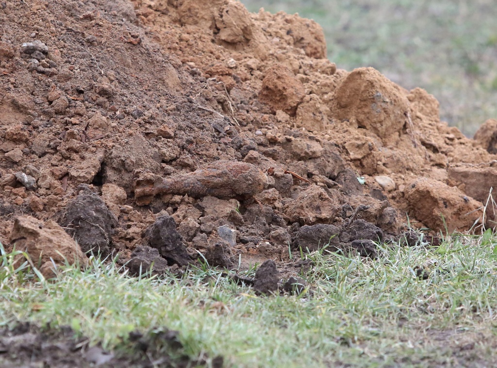 Опасный предмет был найден у стены одноэтажного жилого дома по улице Дзержинского, когда экскаватор копал траншею для прокладки коммуникаций.