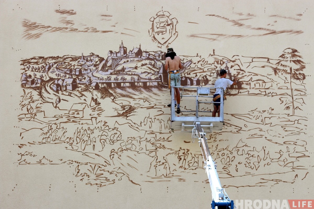 Второй день художники из дизайн-студии «Zadelo» рисуют большую копию гравюры Цюндта на фасаде гимназии №10 в Гродно. К концу недели авторы планируют представить горожанам свою работу.