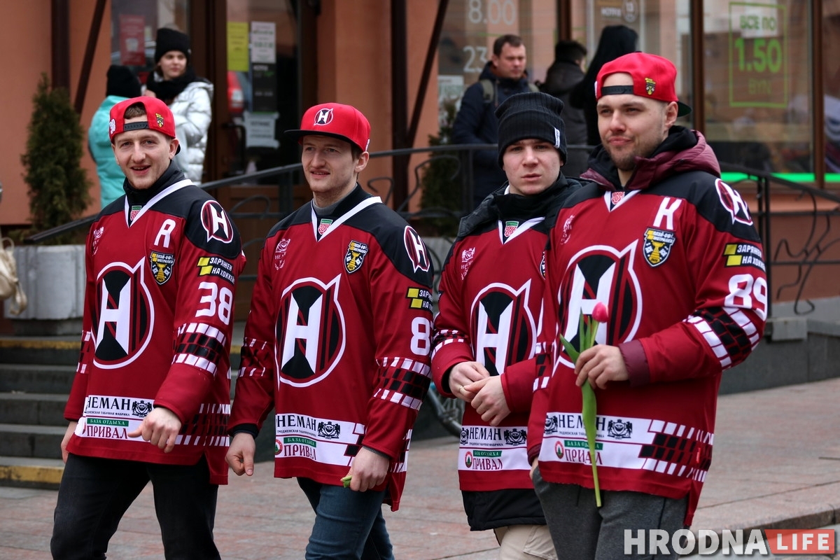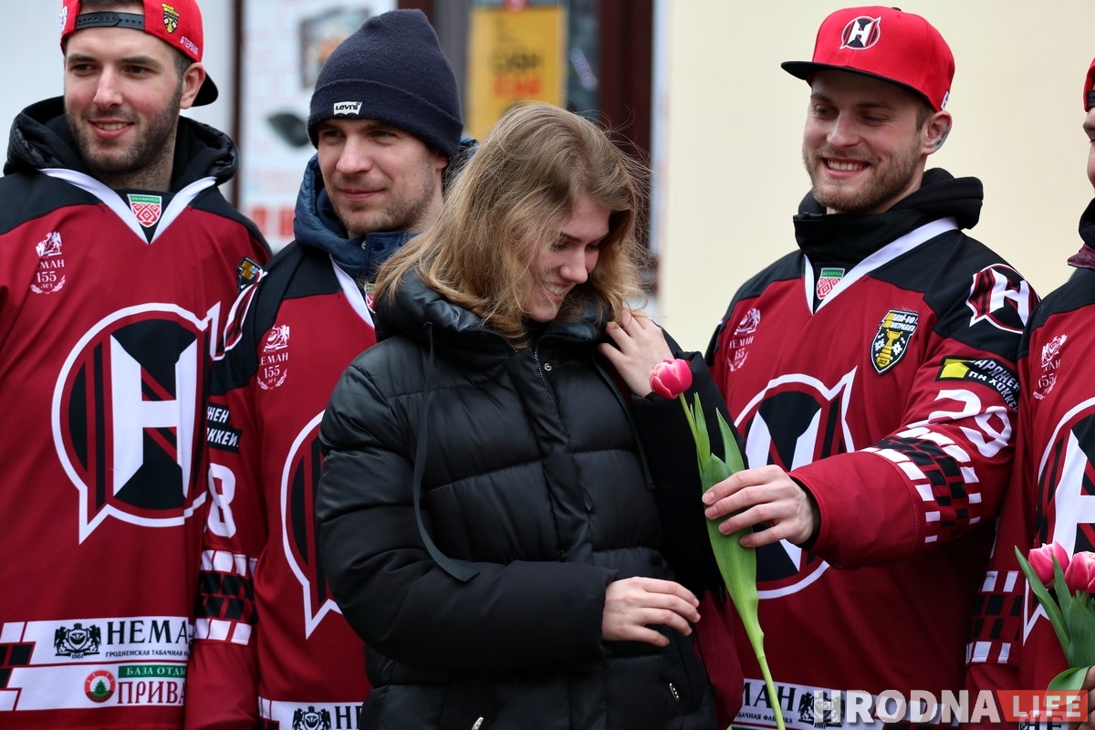 В преддверии международного женского дня гродненский «Неман» в полном составе вышел в центр города и поздравил женщин с наступающим праздником. Гродненки от хоккеистов получали в подарок тюльпаны.