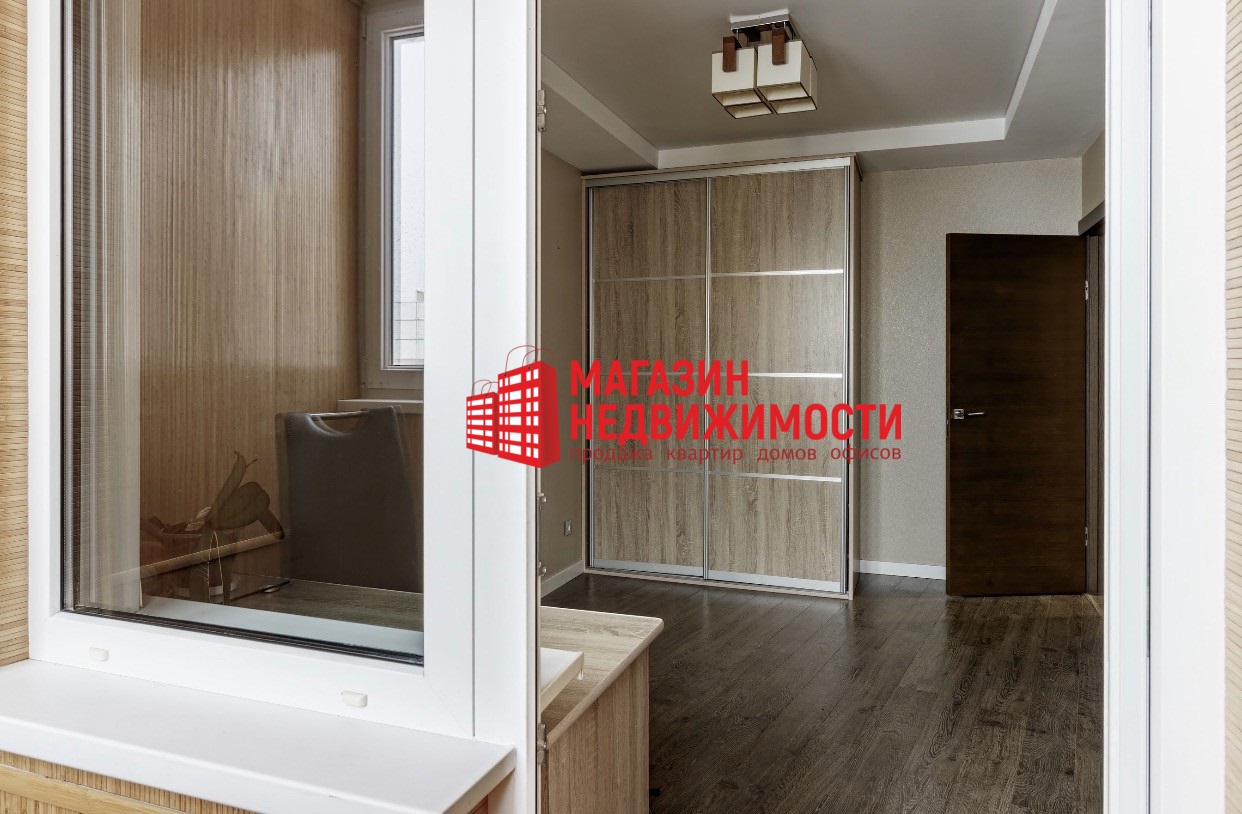 Продается трехкомнатная квартира на ул. Белые Росы, 79. В ней сделан дизайнерский ремонт. В зале установили электрокамин и большой диван. “Акцентная цветовая гамма в интерьере, качественные и дорогие материалы отделки квартиры”, — обещают продавцы.