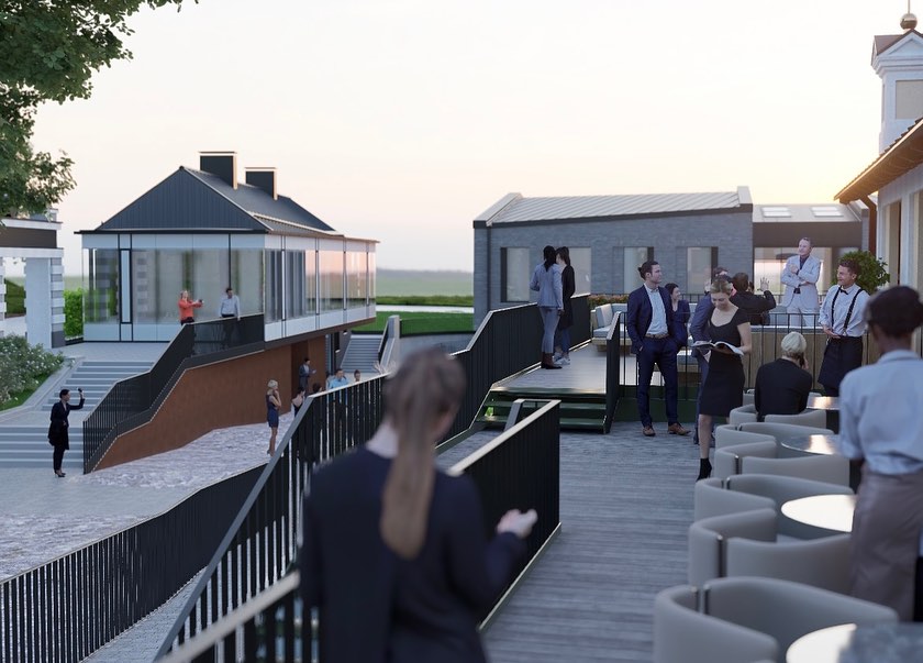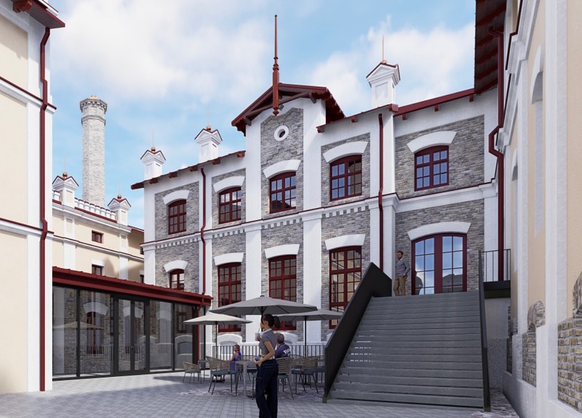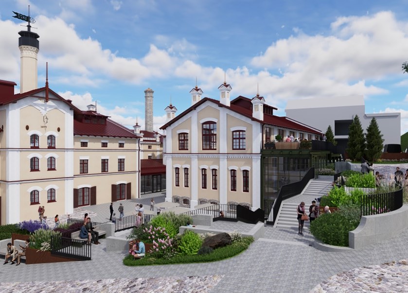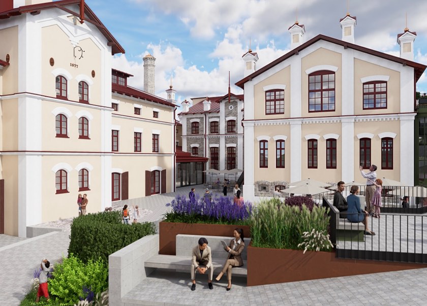 На визуализациях исторические здания преобразуются в современное общественное пространство с кафе, офисами и зонами для отдыха. Старые фасады сохранят аутентику: светлая штукатурка, красные крыши, декоративные элементы. Рядом возводятся новые здания с минималистичным дизайном и большими стеклянными фасадами. Они не мешают старой архитектуре, а создают гармоничный контраст.