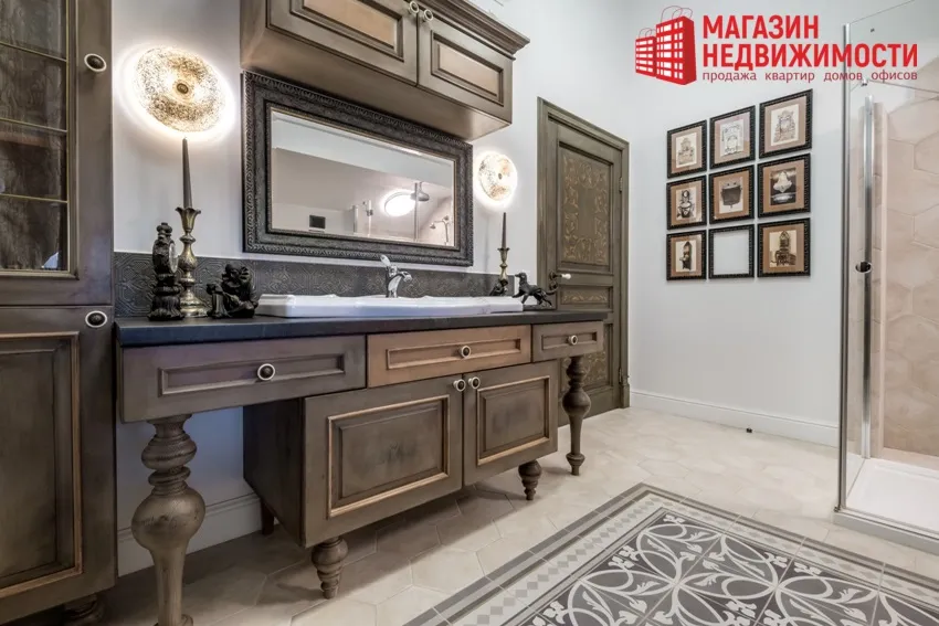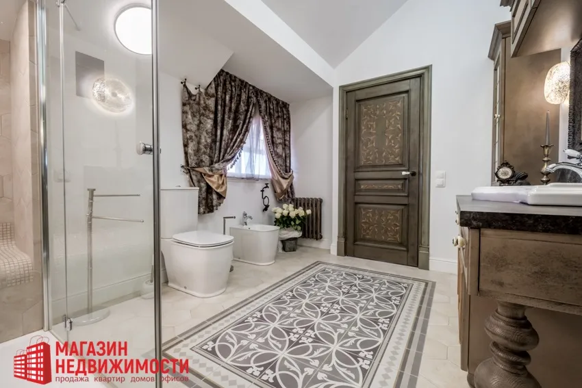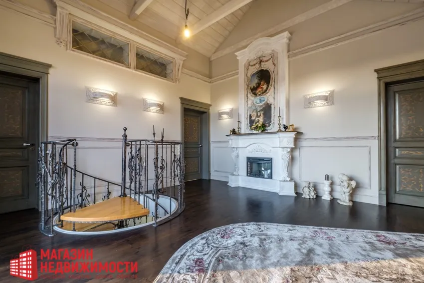 Внутри — камины, антикварные шкафы, много деталей: подсвечники, статуэтки, текстиль. На второй этаж ведет кованая винтовая лестница. Санузел оформлен плиткой с орнаментом и драпировками. Пространства много, много света, но интерьер требует бережного отношения. Подойдёт тем, кто ценит стилизацию и атмосферу, а не практичность.