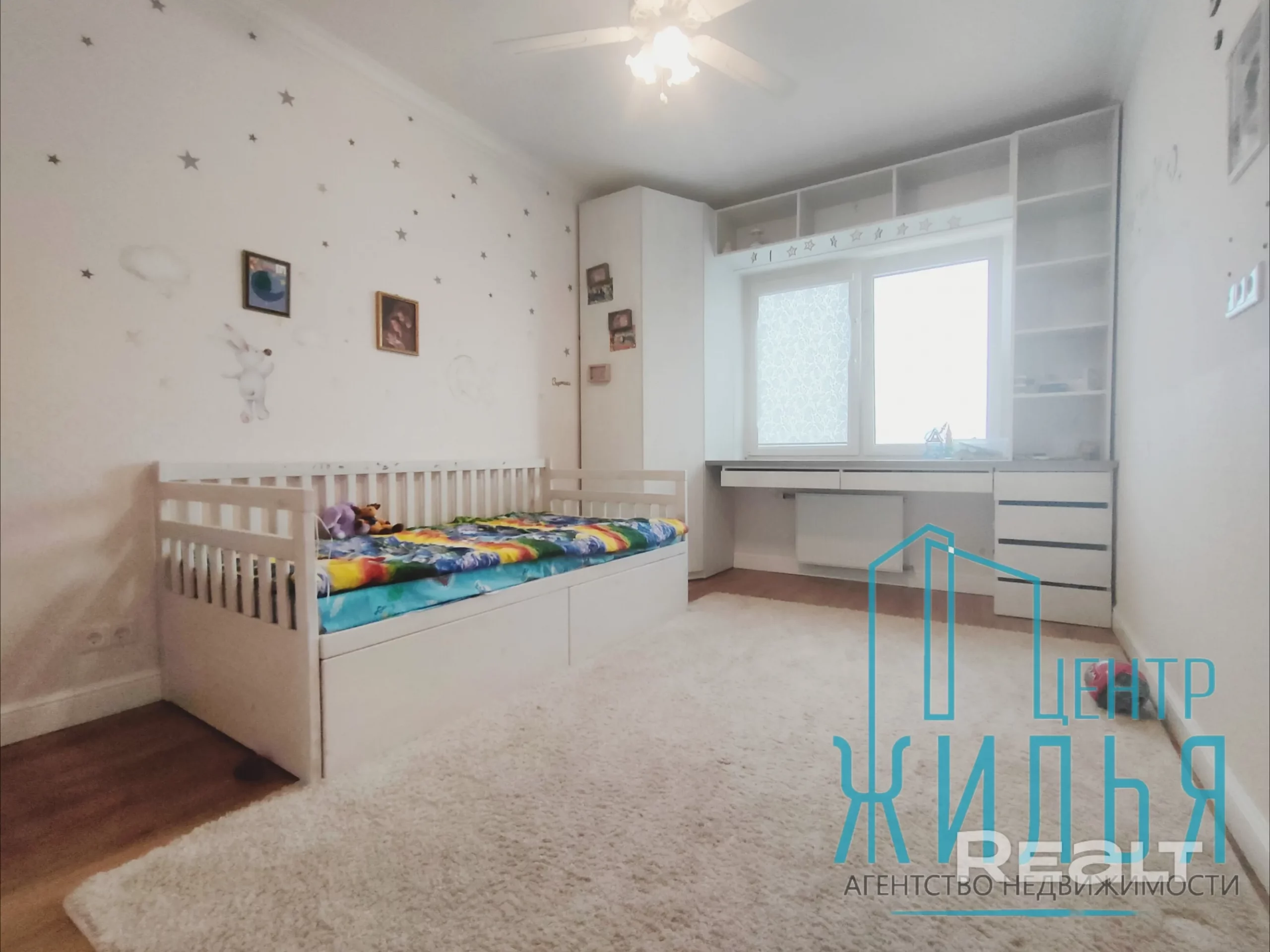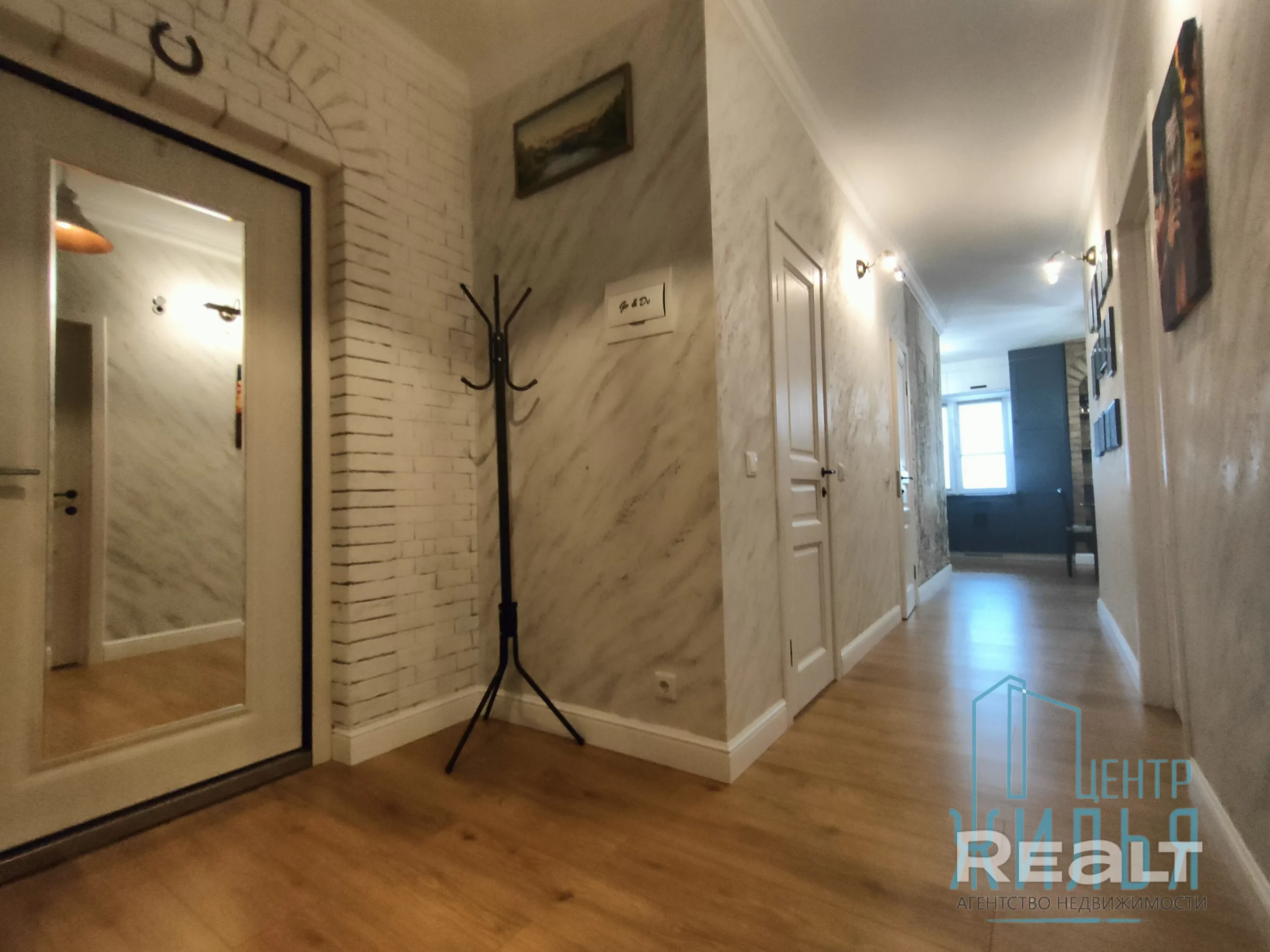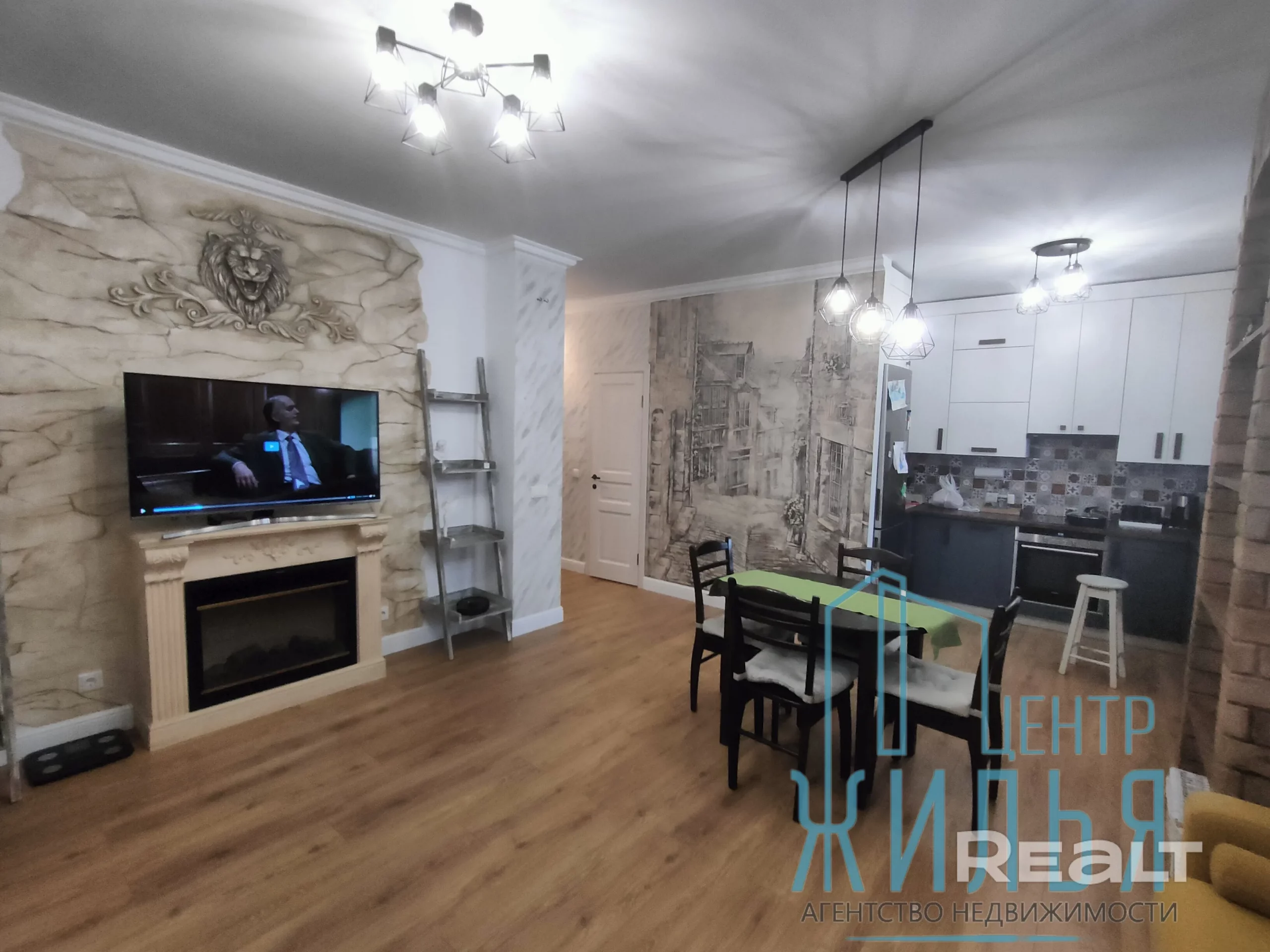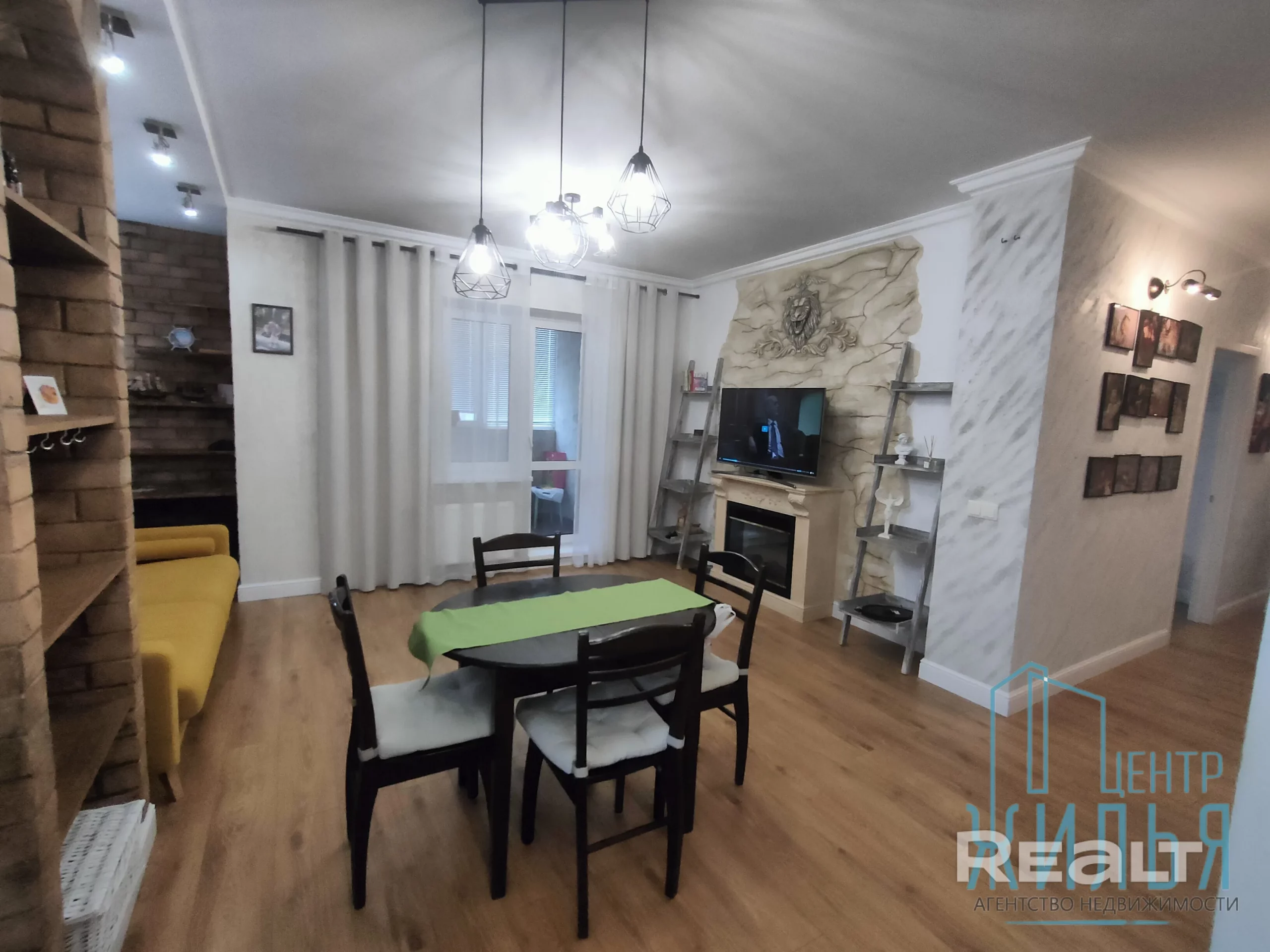 Квартира с ремонтом в стиле лофт. Пространство объединённой кухни и гостиной оформлено декоративным кирпичом и лепниной, разработанной белорусской художницей, на стене — стильный рисунок. В этой зоне установлен декоративный камин. Освещение регулируется: на кухне — две люстры и точечные светильники. Спальня и детская выполнены в спокойных оттенках, стены оклеены обоями.