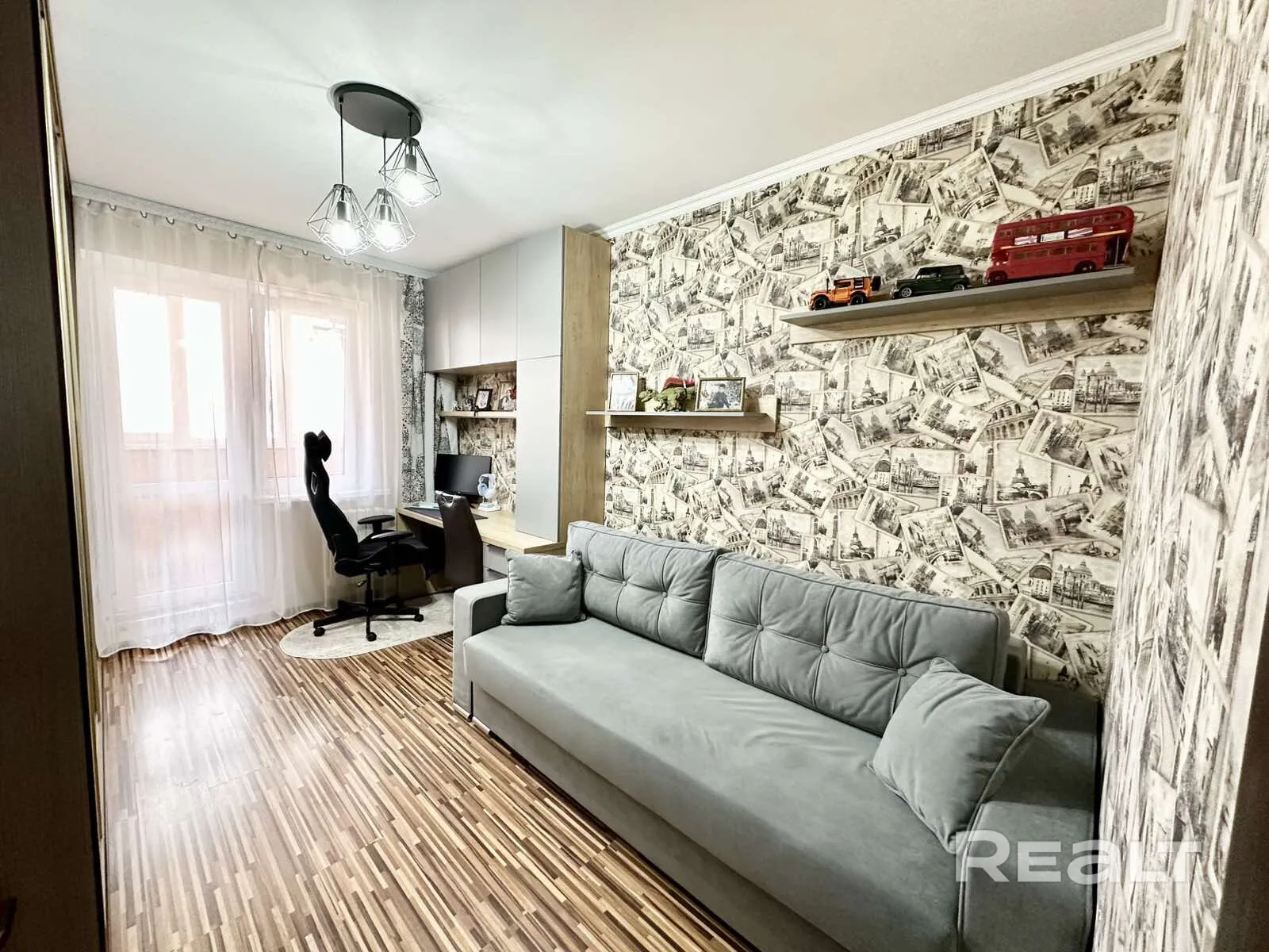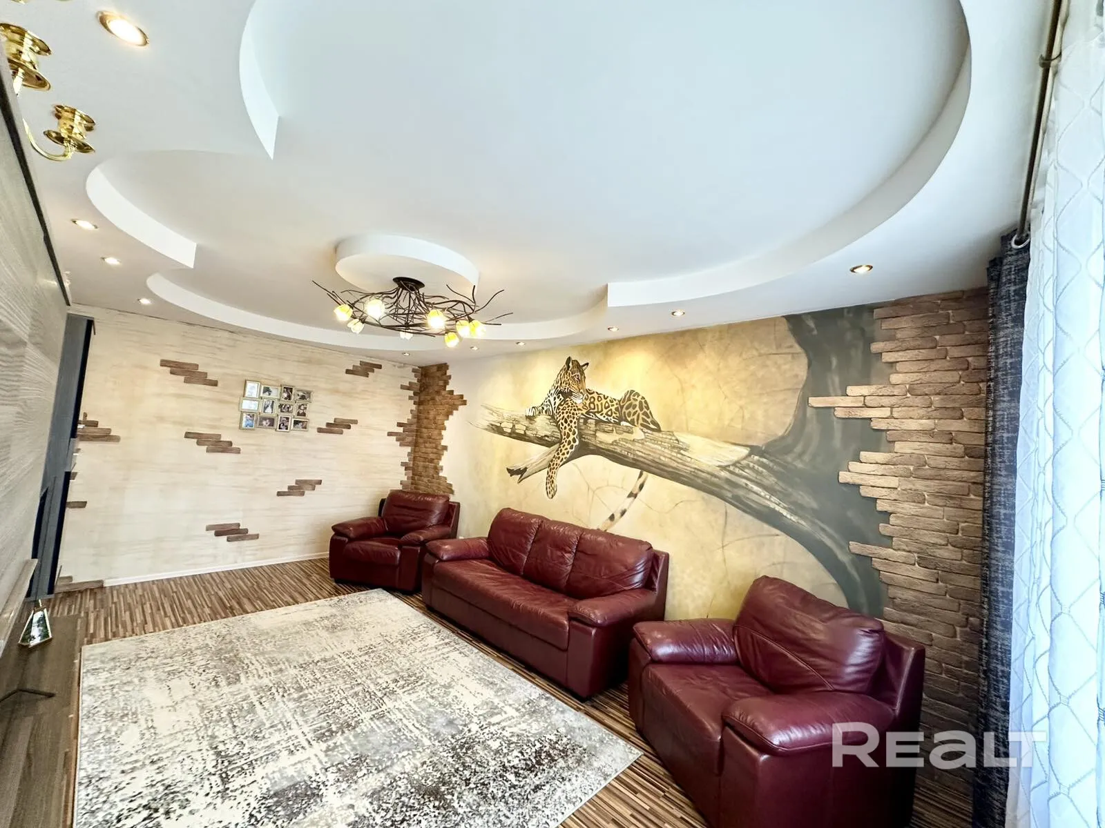 Гостиная оформлена в тёплых тонах с декоративной стеной с имитацией кирпичной кладки. Люстра отсылает к зарослям кустарника в саванне, а на стене разлегся большой леопард. Два кожаных кресла и диван выделяют зону отдыха. В коридор ведет арка, также отделанная под кирпич, а там — обои в зигзаги и вокзальные часы, на стенном шкафу — скалы. Стены другой комнаты тоже мотивируют к путешествиям: обои оформлены открытками с мировыми достопримечательностями. На стенном шкафу в ней разлегся тигр.