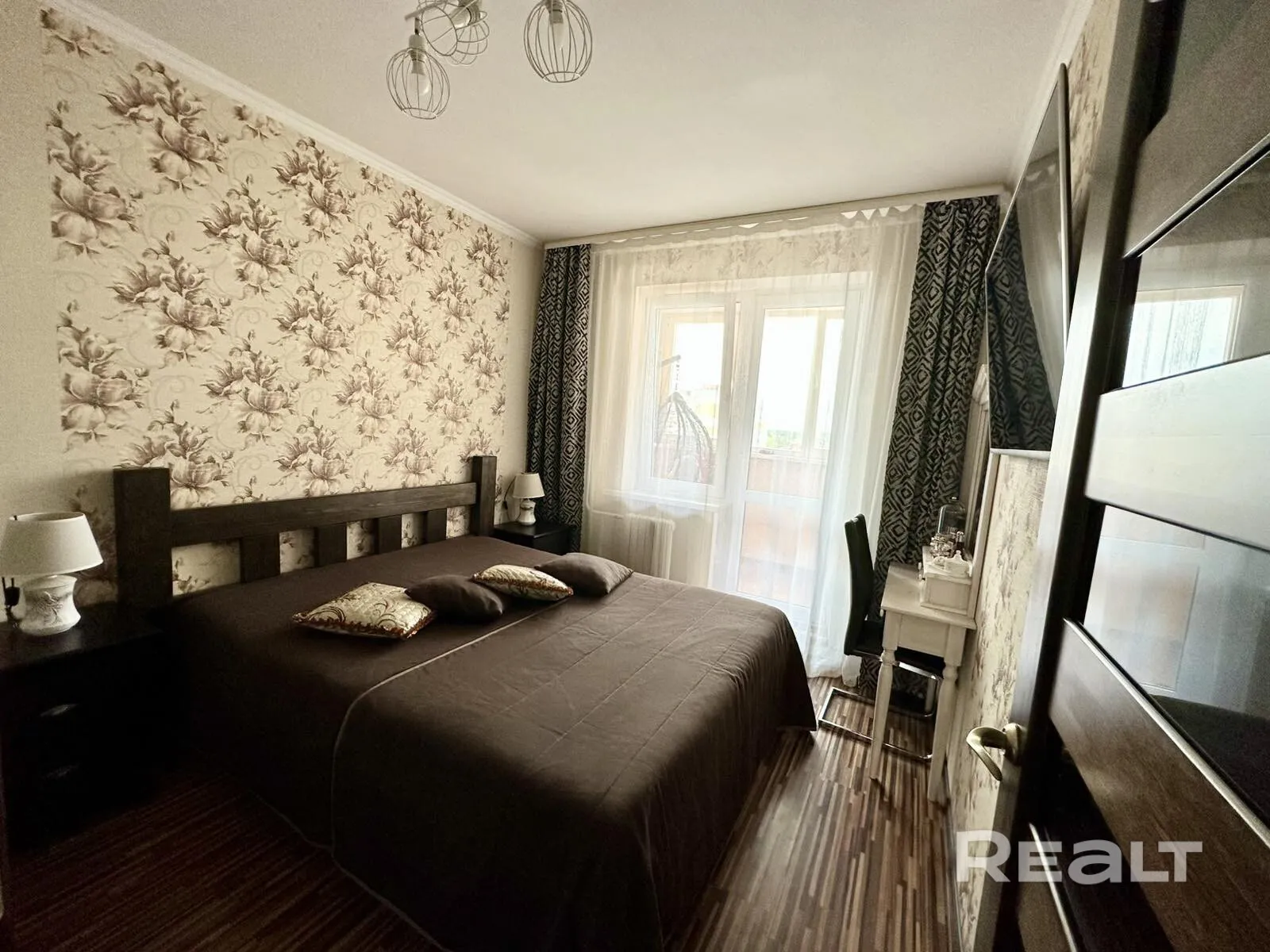В спальне — спокойные цвета, обои с цветочным рисунком, тёмная деревянная мебель. Из комнаты есть выход на застеклённую лоджию, где оборудована уютная зона с подвесным креслом. Все комнаты изолированы. Установлены три вместительных шкафа-купе.