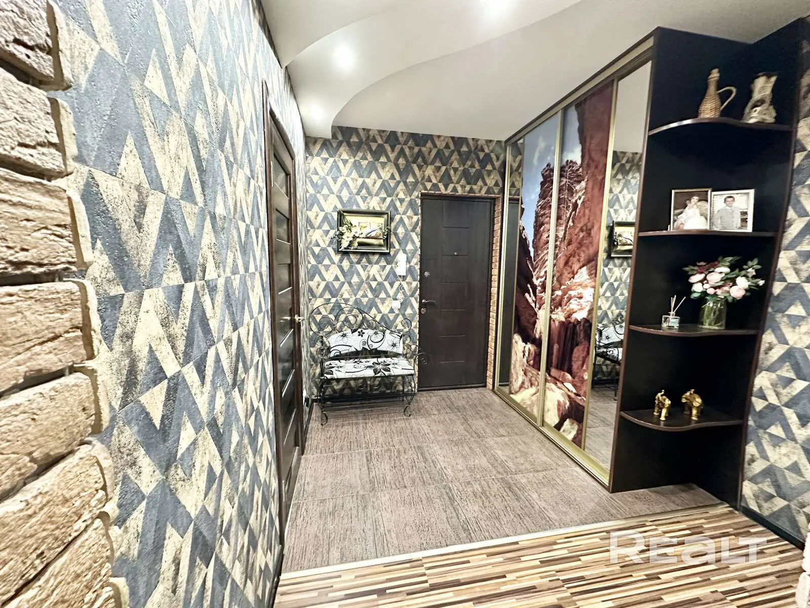 Интерьер квартиры с ярко выраженной авторской отделкой, построенной на контрастах: текстуры дерева, декоративный камень и крупные фотопринты на стенах сочетаются с глянцевыми фасадами кухни и нейтральными оттенками мебели.
