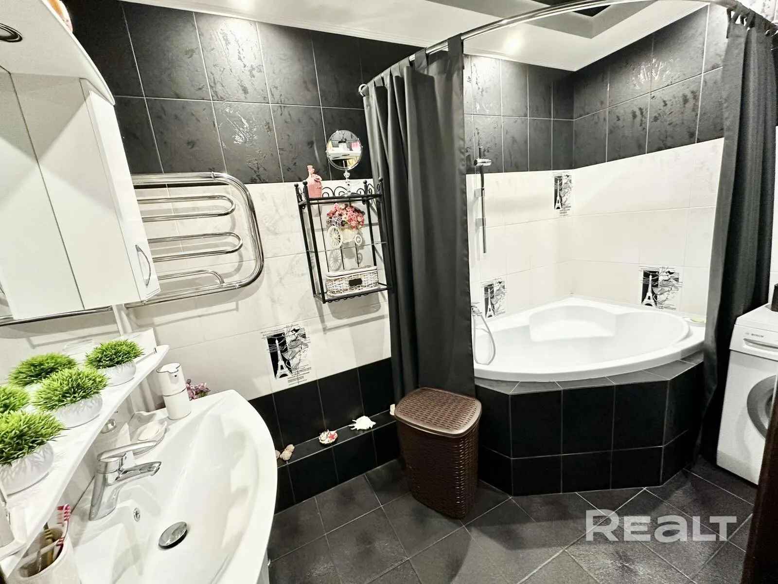 Кухня площадью 11,9 м² — ярко-жёлтая с чёрным низом, встроенной техникой и столовой зоной. Ванная довольно стильная, отделана черным и белым, туалет — отдельно.