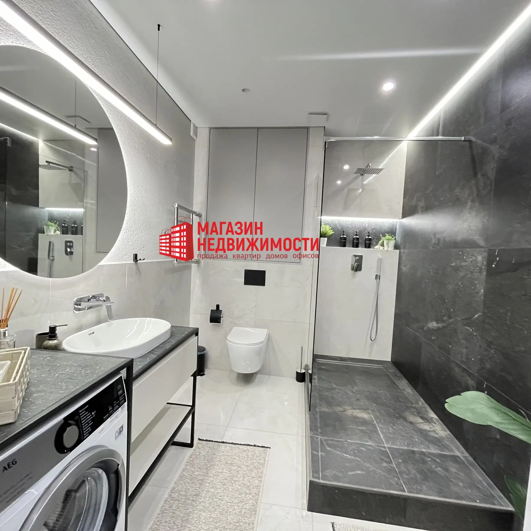 Санузел совмещённый, с большим круглым зеркалом. Душевая отделана тёмной плиткой, рядом — подвесной унитаз, умывальник и стиральная машина, есть бойлер. В прихожей установлены зеркальный шкаф и система хранения. На застеклённой лоджии установлен деревянный подоконник с функцией стола — может быть и рабочая зона, и зона отдыха. Лоджия выходит во двор с детской площадкой. За квартирой закреплен подвал.