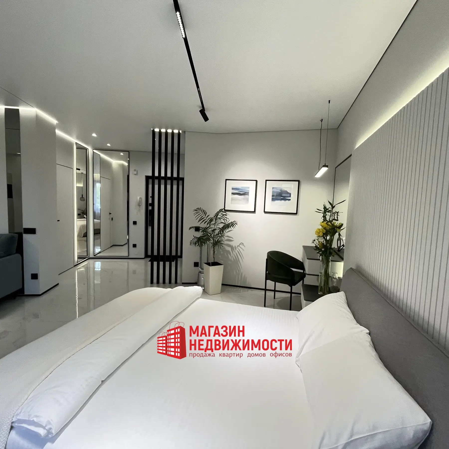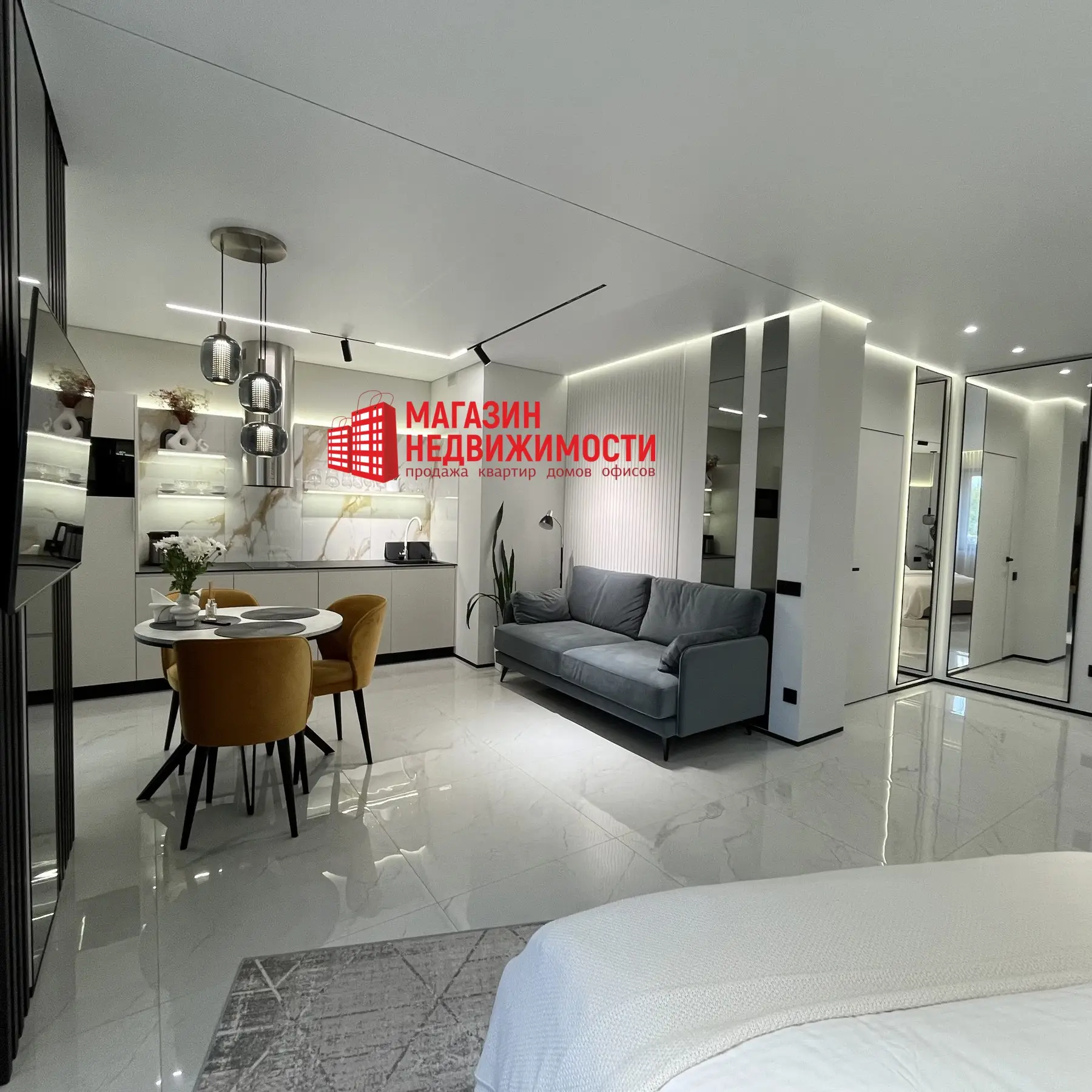 Жилая зона отделяется визуально. У стены стоит двуспальная кровать с мягким изголовьем. Рядом обустроено рабочее место с зеркалом и креслом. Весь пол выложен глянцевой плиткой, освещение состоит из подсветки и точечных светильников в одном стиле. Множество зеркал увеличивают пространство.