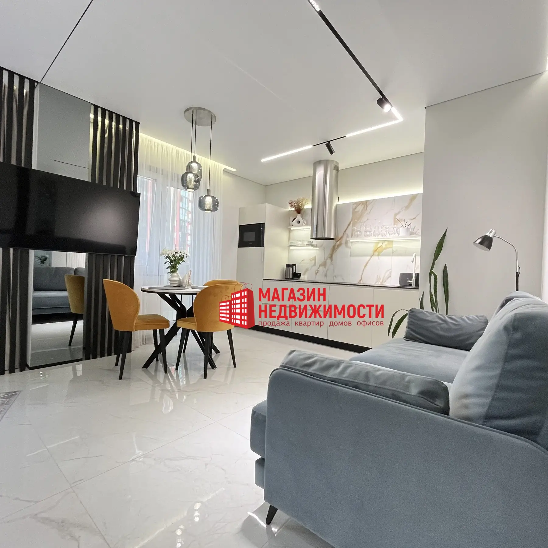 Интерьер лёгкий, лаконичный, в светлой гамме с минималистичными деталями. Стилистику пространства объединяют вертикальные планки в разных частях квартиры, одновременно разделяя функциональные зоны. Белоснежная компактная кухня с техникой дополнена фартуком под мрамор и подсветкой. Рядом стоит обеденный стол с акцентными креслами горчичного цвета, за освещение отвечают низко спущенные выразительные светильники.