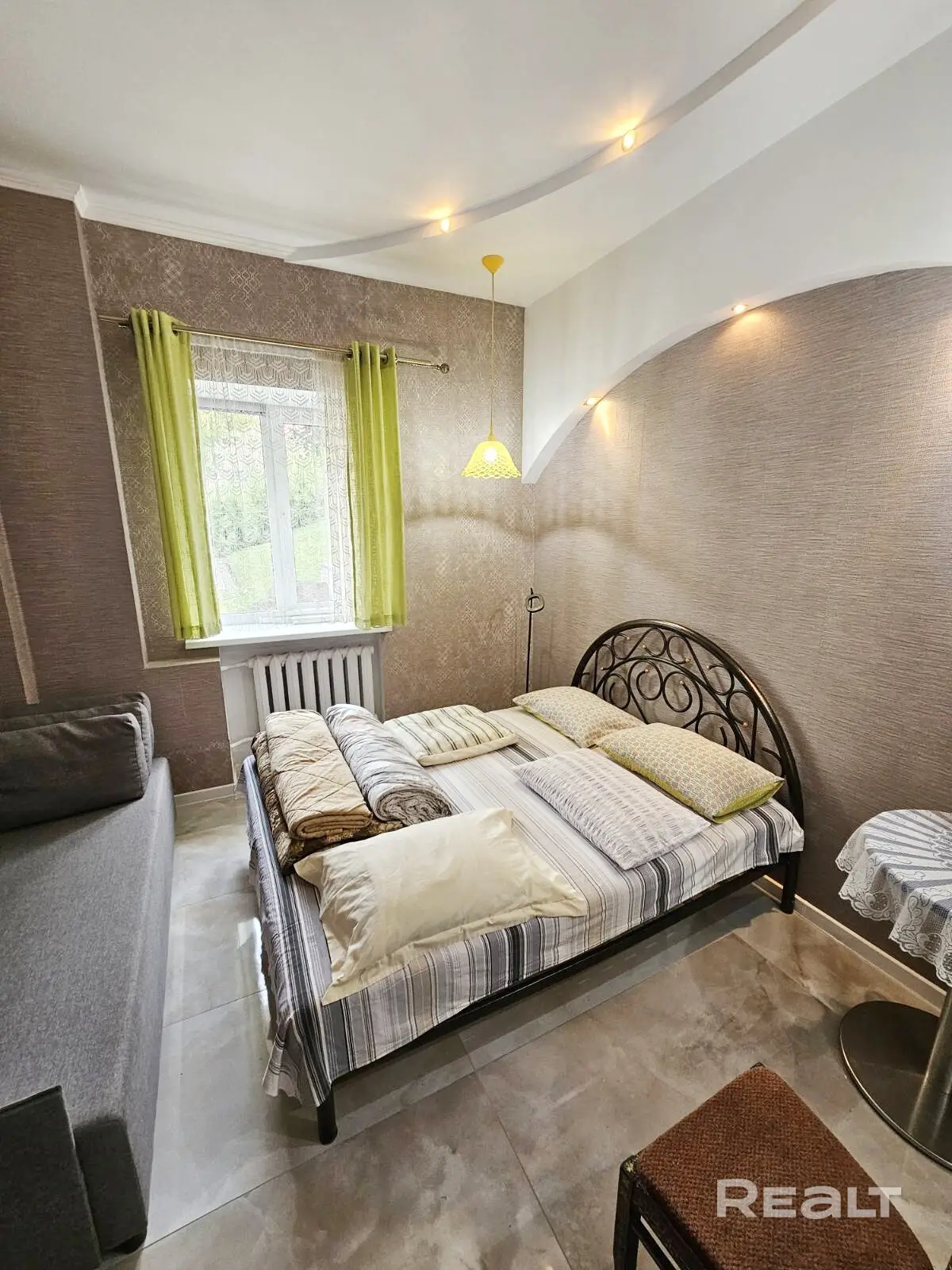 Кухня оформлена в светлые тона с отделкой стен под кирпич. Здесь удобно разместили всю бытовую технику, в том числе стиральную машину. Акцентом стал синий диван. В жилых комнатах мягкий свет, в каждой — по двухспальной кровати, рельефные элементы на потолке и стенах. В квартире аккуратный ремонт и много диванов. Подключены телефон и интернет.